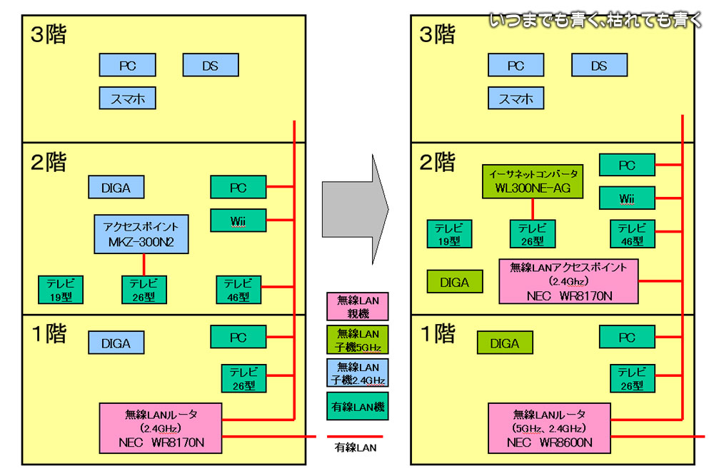 子機の設定は、DIGAのみ5GHz帯を使う設定にし直して、DIGAはWR8600Nと無線通信。あとの子機の設定はそのままにし、今まで通りWR8170Nと無線通信。WR8170Nは今までは1階に設置してあったのが2階に設置となったことで、2階、3階の電波状態は格段に改善されました。