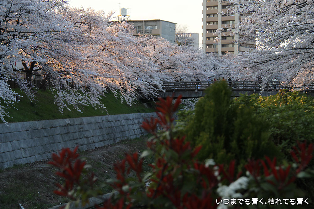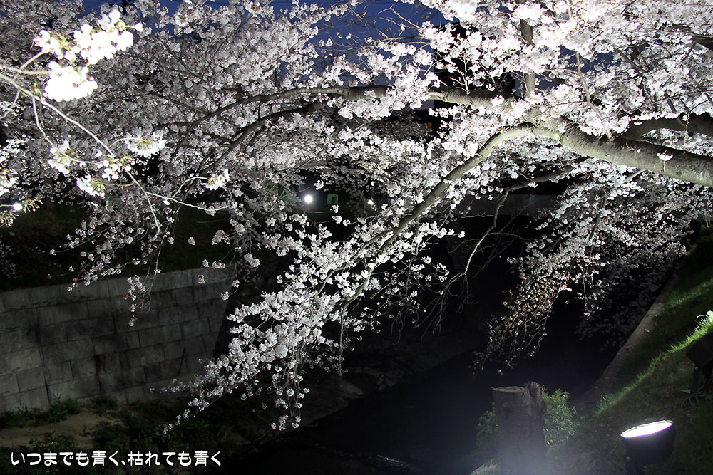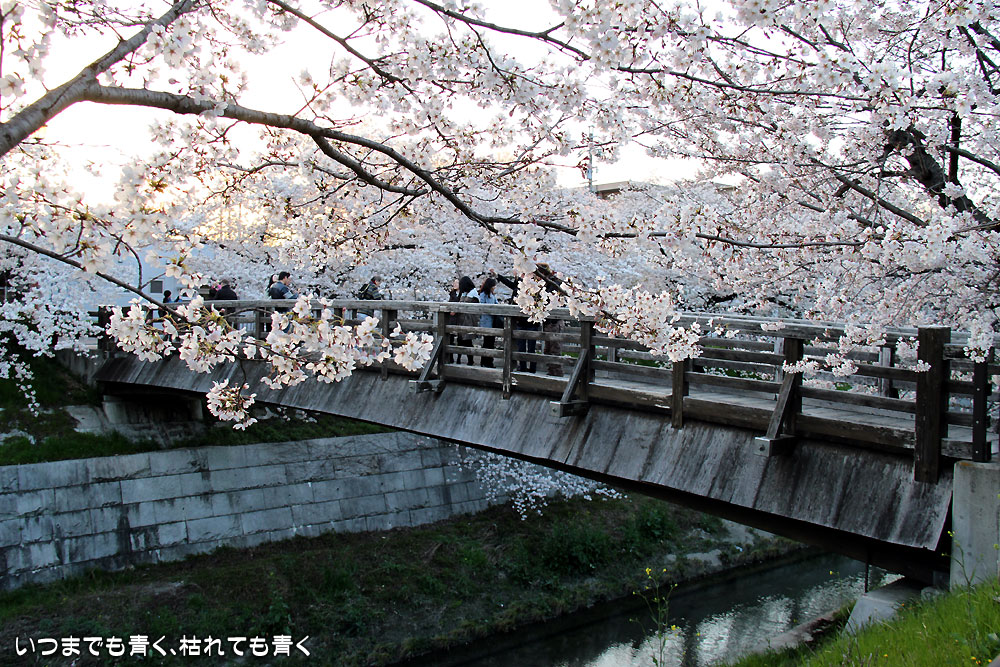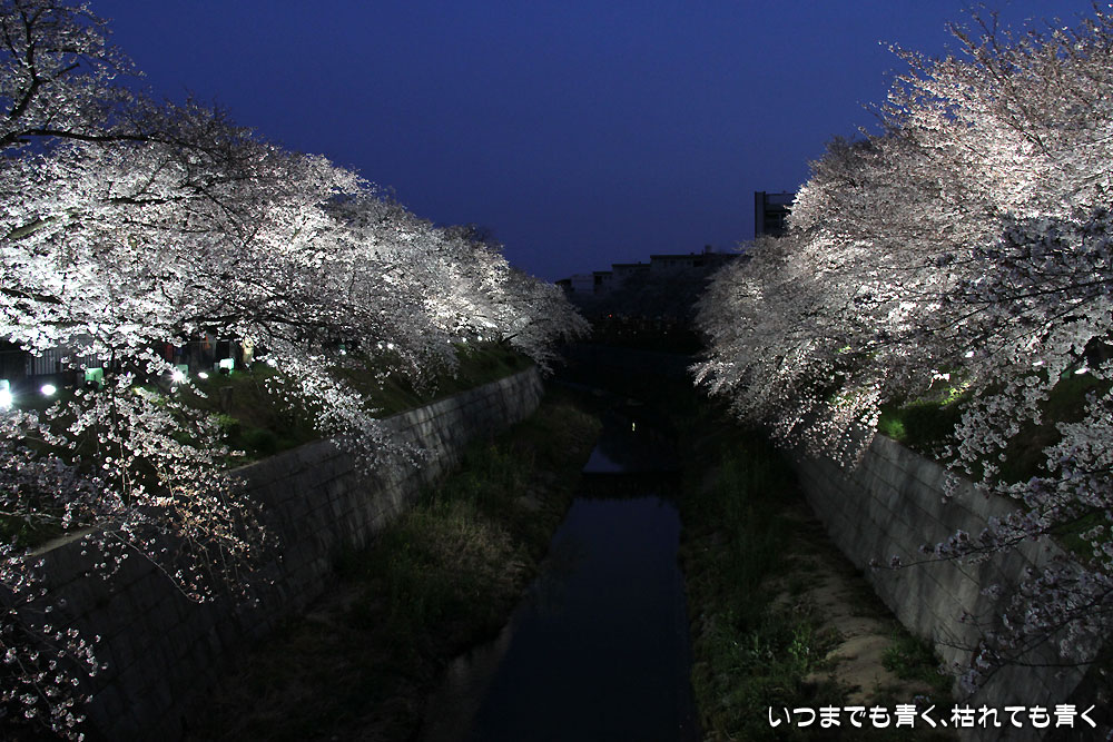 クルマは、瑞穂運動場の有料駐車場に停めて、そこから山崎川沿いをライトアップの区間までしばらく歩くのですが、山崎川の両側は、ずっと桜並木になっています。全部の区間がライトアップされると美しいと思うのですが、ライトアップされるのは、鼎(かなえ)小橋と鼎(かなえ)橋の100メートルほどだけです。鼎小橋は木橋で赴きのある景観となっています。山崎川の両側の道にも、川に降りる階段や、景色を眺めるデッキなどが作られていて、のんびりと散策する道としてもいいところです。