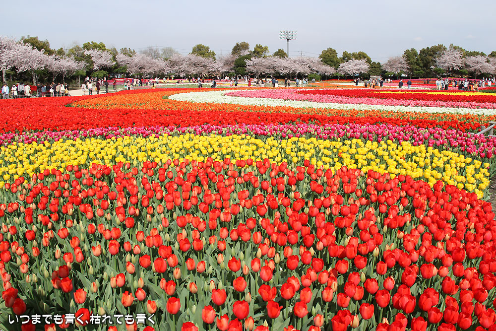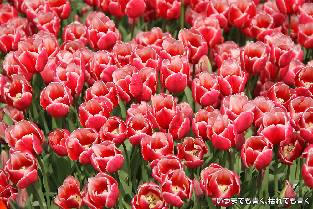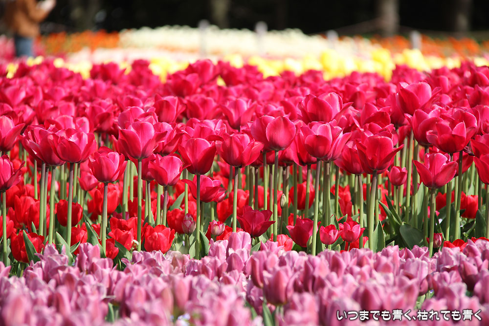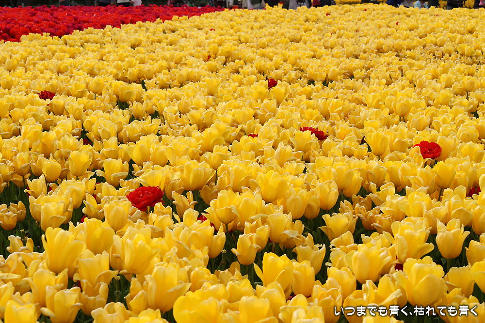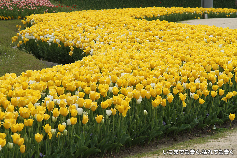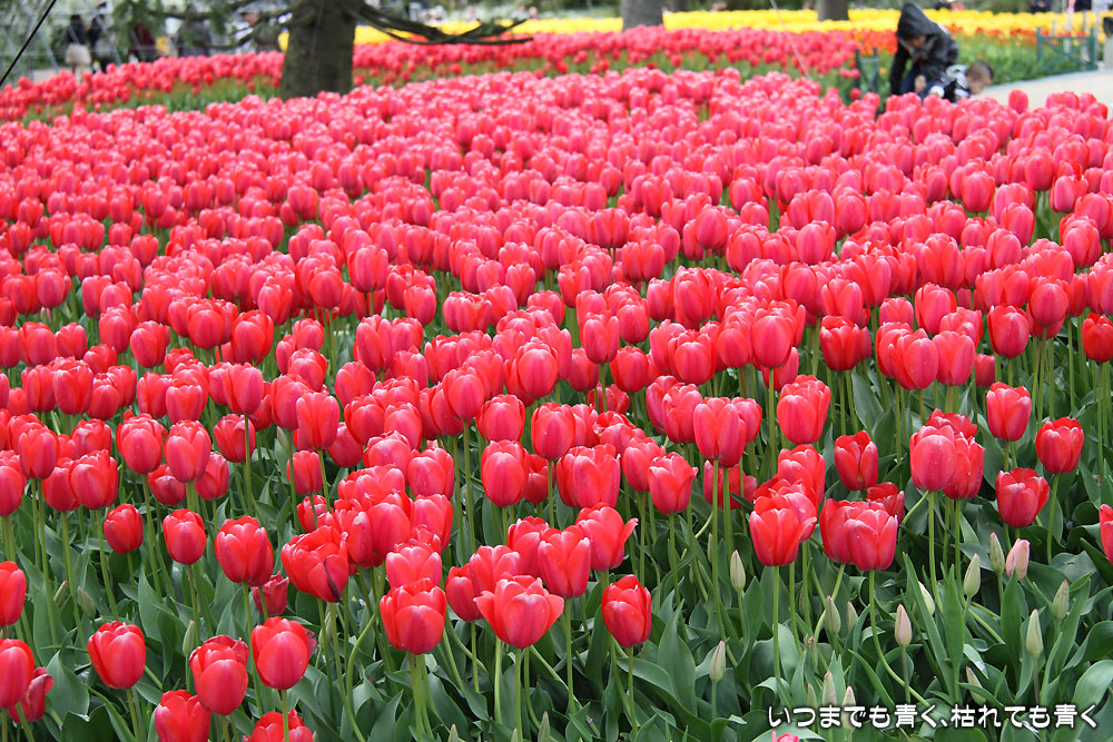 「なばなの里」のチューリップは、昨日の「奥殿陣屋」のチューリップとは桁違い。その違う桁は一桁や二桁ではありません。「なばなの里」のチューリップは、圧倒されるほどの広さと数と種類です。案内によると、190品種、180万球のチューリップが植えられているとのことです。