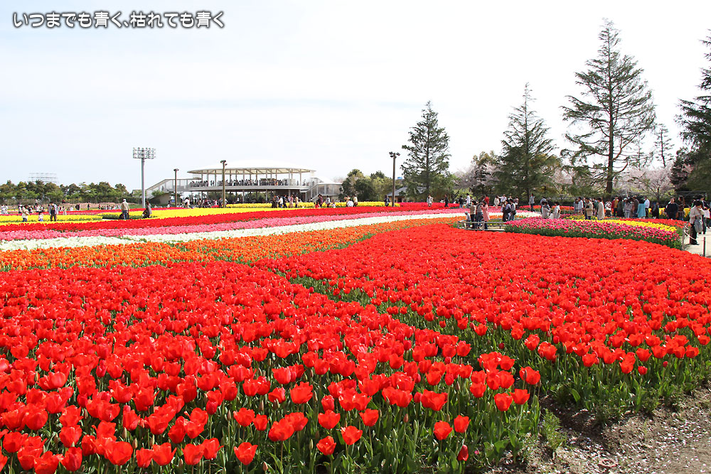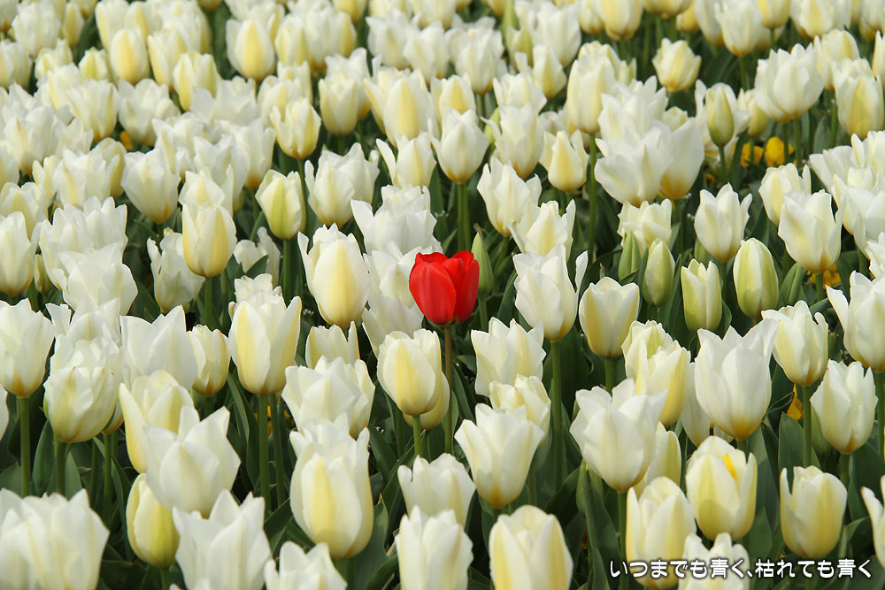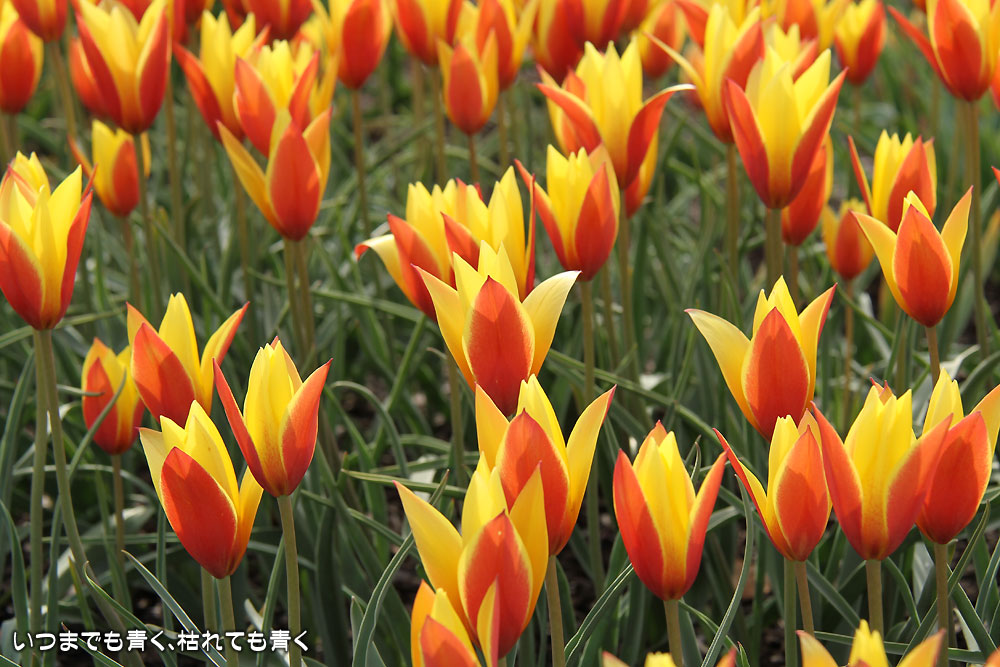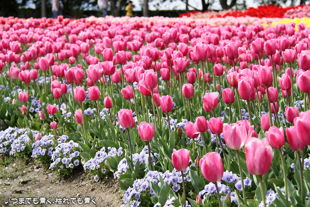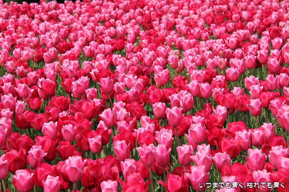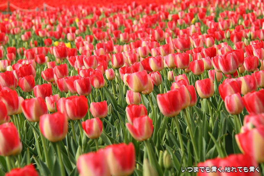 「なばなの里」のチューリップは、昨日の「奥殿陣屋」のチューリップとは桁違い。その違う桁は一桁や二桁ではありません。「なばなの里」のチューリップは、圧倒されるほどの広さと数と種類です。案内によると、190品種、180万球のチューリップが植えられているとのことです。