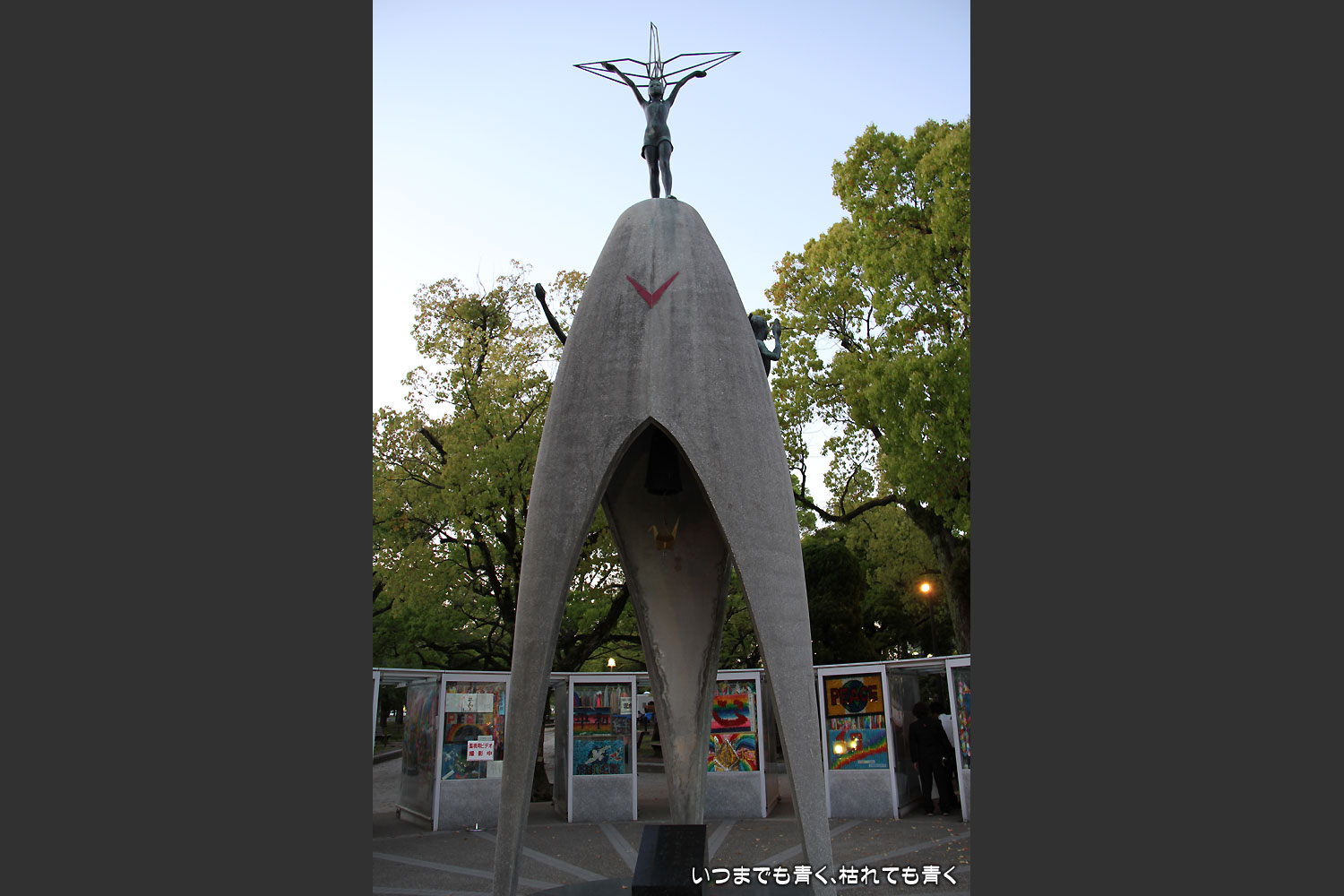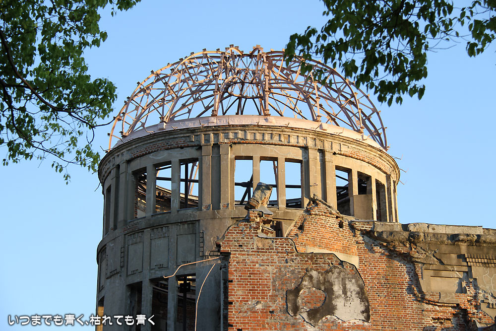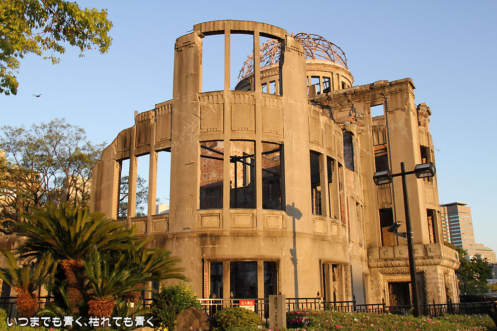 まわりには、原爆ドームを見下ろす高いビルがいくつも建ち、美しい緑の木々と穏やかに流れる元安川、そこを赤く照らす夕日が柔らかくそそぐ。当時の悲しい出来事を思えば思うほど、今のこの平和な日本がありがたく感じてしまう光景でした。