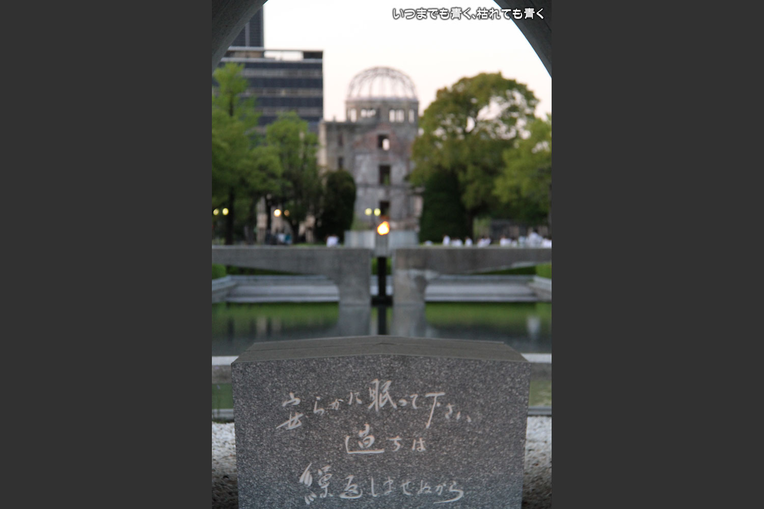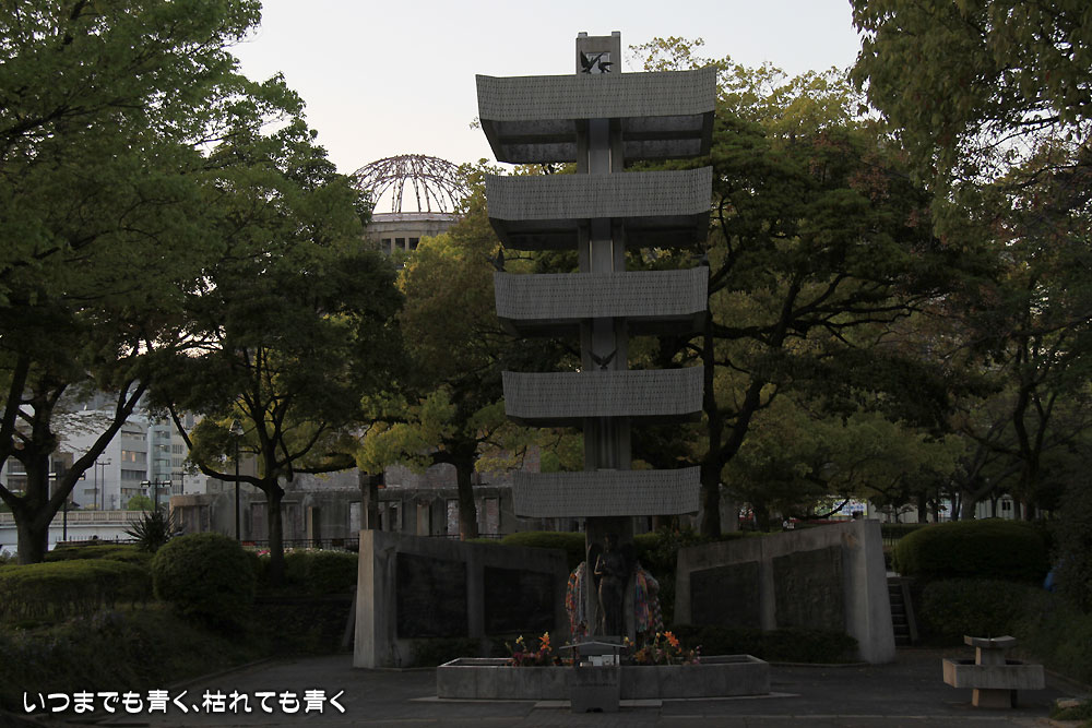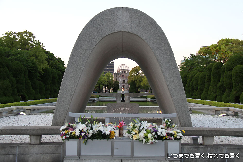 原爆死没者慰霊碑は、アーチの中に、平和の池があり平和の灯があり、その先に原爆ドームが一直線に並ぶように作られています。碑文には、「安らかに眠って下さい 過ちは繰返しませぬから」という言葉が刻まれています。この文は、主語が誰かでいろいろと話題になりましたが、その時は、そんな議論はバカバカしいと感じていましたね。趣旨をしっかりと受け止めていれば、おのずとその主語はわかるだろうにと思っていましたから。