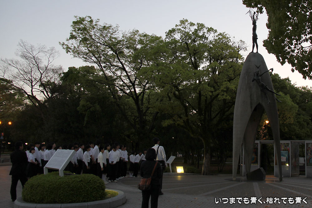 帰り際に「原爆の子の像」に来たら、その前に中学生らしき集団がいて、全員で平和の誓いを大きな声で誓っていました。地元の学校の生徒なのか、修学旅行の生徒なのかわかりませんが、ここに来ると千羽鶴を捧げ「平和の誓い」を朗読するのでしょうね。若い人たちには、当時日本で起きていたことやここで起きた事をよく知ってもらって、戦争や争いごとを美化することなく平和を大切にしてほしいと、心から思います。私も若い頃には気づかなかったことなので、なかなか難しいとは思いますけどね。