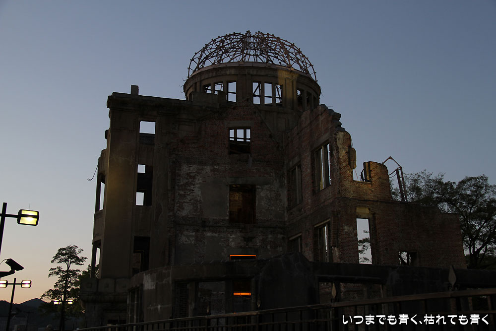 原爆ドームと平和記念公園は夕方に訪れましたので、原爆ドームと原爆死没者慰霊碑を見ていろいろ考えていたら日が落ちてしまい、平和記念公園の中のたくさんの慰霊碑や記念碑を見逃してしまいました。平和の鐘も近くまで行っていたのに、日が暮れて引き返してしまったために、見る事ができませんでした。最初の予定では、翌日の朝に原爆ドームと平和記念公園を見てから宮島と呉に行こうと思っていたのですが、どうもその予定は時間的に苦しいと思って、原爆ドームと平和記念公園は夕方に来てみたのですが、原爆ドームと平和記念公園、そして平和記念資料館をじっくりと見るとなると、ここだけで半日はかかりそうに思いました。一日やそこらでは、広島近辺を楽しむには無理があることがよくわかりました。定年後でも時間がたくさんできた時には、じっくりと時間をかけて訪れたい場所です。