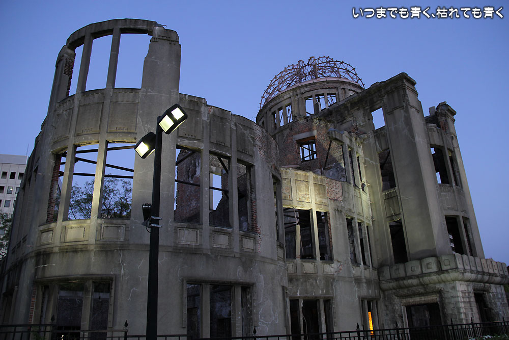 ![]() 日没後の原爆ドーム南側 | ![]() ライトアップで浮かび上がる原爆ドーム西側 |