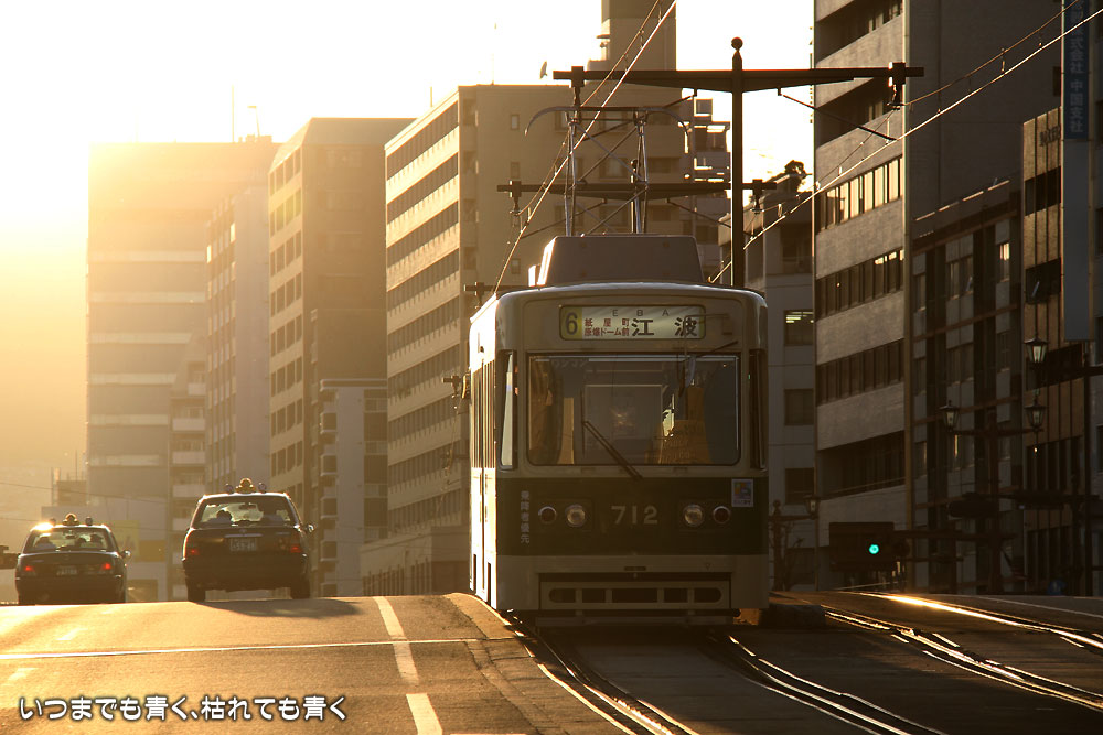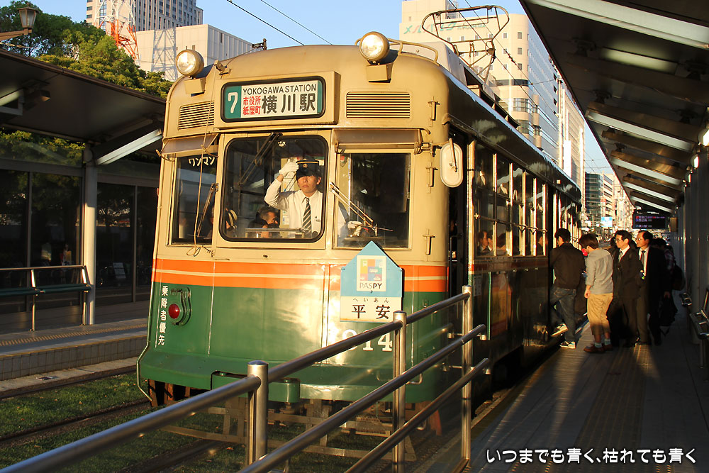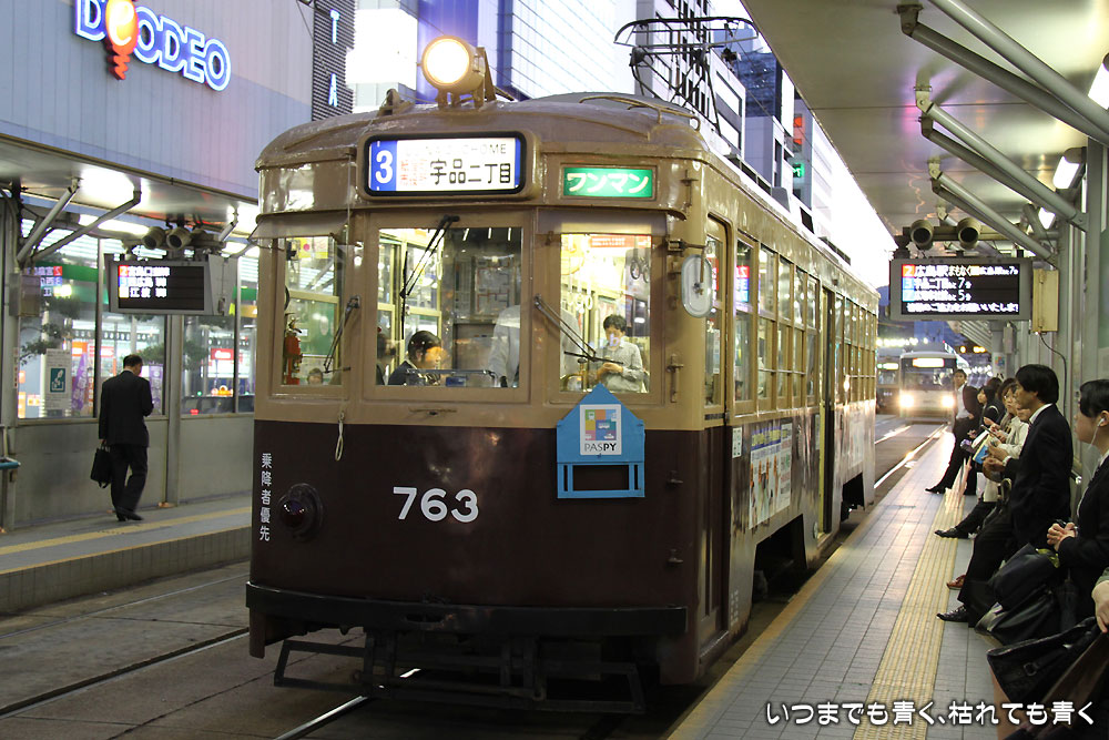 今回、広島駅から原爆ドームに行くためには、広島電鉄の路面電車を使いました。市内一律150円で乗れます。最初は勝手がわからないのと、何処に行くのかがわからずに戸惑いました(結局2番6番に乗れば良かったのですが・・・)が、乗ってみると便利ですね。しないでもお客さんがいっぱいでしたし、西広島から宮島口までずっとJRと併走しているのですが、その区間もJRから見ていたら夜でも満員でしたので、けっこう利用されているようです。ただ、市内は道の真ん中にホームがあるので、クルマには要注意です。特に西日でクルマから信号が見えにくかったらしく、歩行者側の信号が青になったので行こうとしたらかなりのスピードのクルマが私のすぐ目の前を通り過ぎ、もう少しでぶつかるところでした。旅行先で事故に会うほど残念なことはありませんから、ヒヤヒヤものでした。