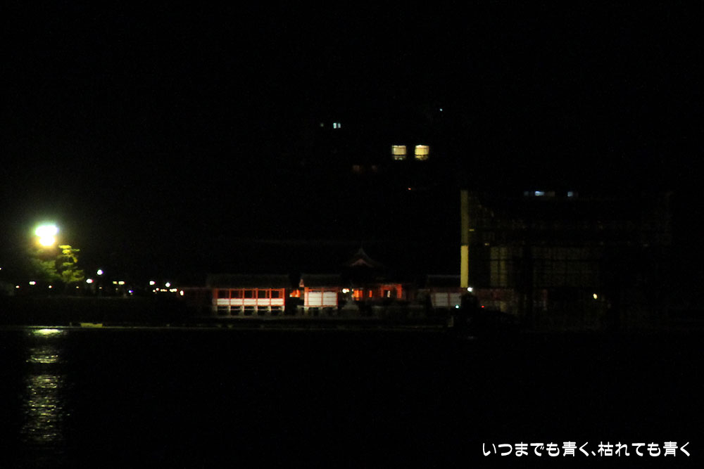 このあとまだ時間があったので、厳島神社のライトアップを見ようと思ってJRで宮島口まで行ったのですが、肉眼ではあまり良く見えませんでした。ライトアップも宮島に渡らないと楽しめないようです。さすがに宮島に渡る時間はなかったので、望遠で精一杯の撮影だけして帰ってきました。