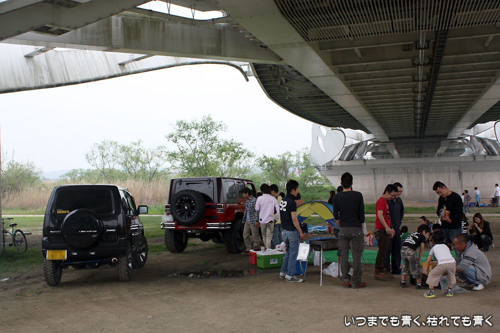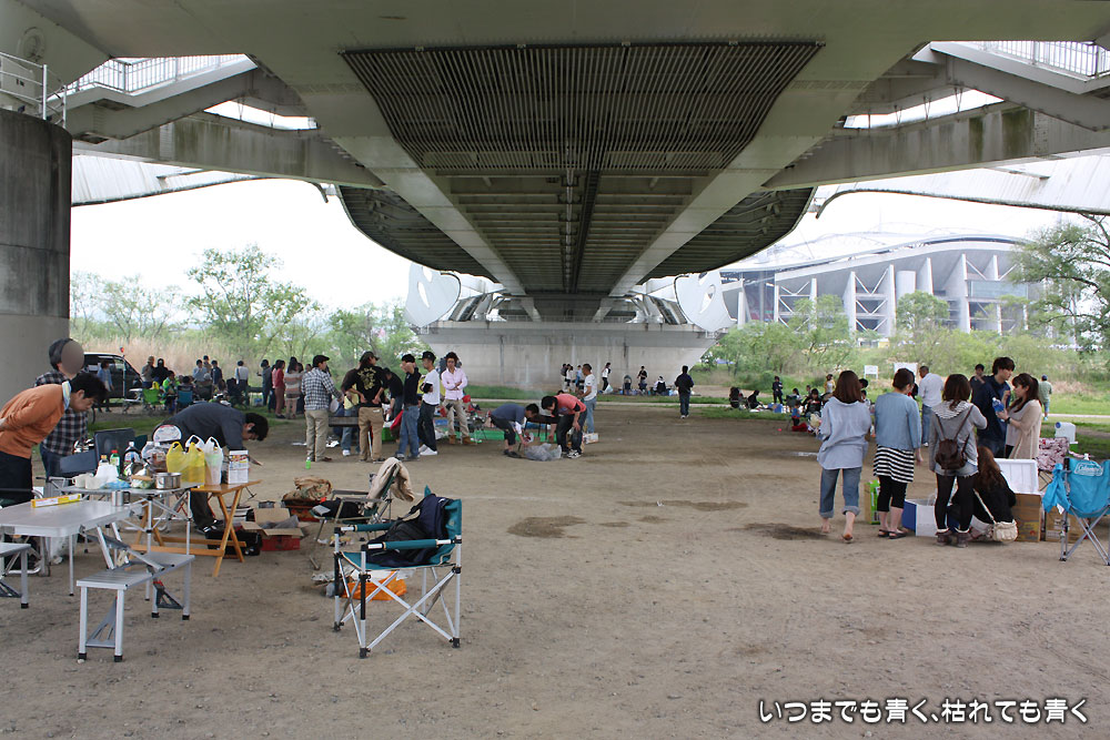 場所はいつもの豊田大橋の下。いつもは、それほど人がいない中での実施ですが、今日はまわりにたくさんの人たち。天候も曇り空ではあるものの、雨の心配はなさそうだし風もなくて寒くも泣く暑くも無い穏やかな日です。ゴールデンウィーク最中だということも合わせて、多くの人が集まるのは仕方がないことだと思いますが、クルマのオーディオ装置で大音量で音楽をかけているグループ、犬をリードもつけずに走りまわさせているグループ、クルマの乗り入れ禁止の場所にクルマを入れてくるグループなど、周りに迷惑をかけるグループもチラホラいて、ちょっとイライラも感じる環境でした。クルマを乗り込ませているグループには、さすがにマナー違反だろうということで、私が注意をしたところ、案外素直にクルマを移動させてくれました。でも、注意されないとわからないのでしょうかね。