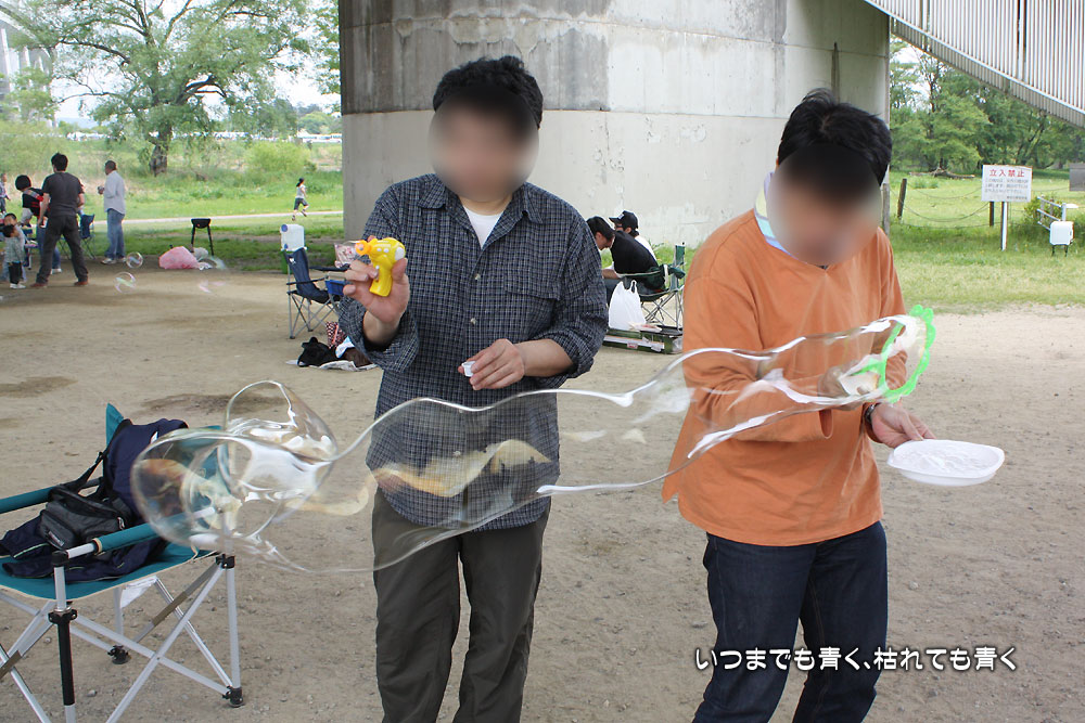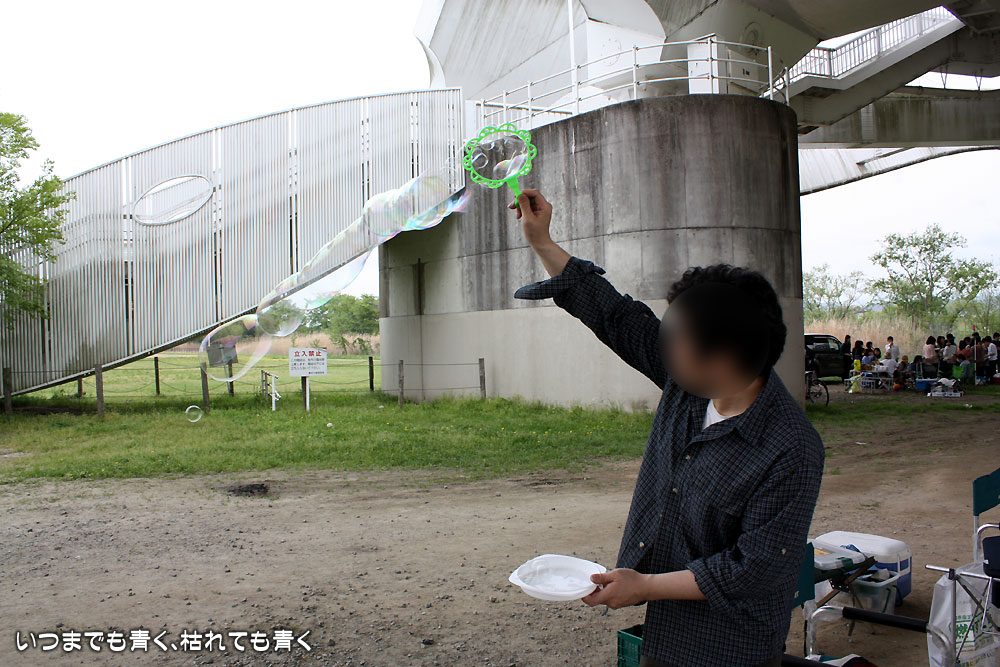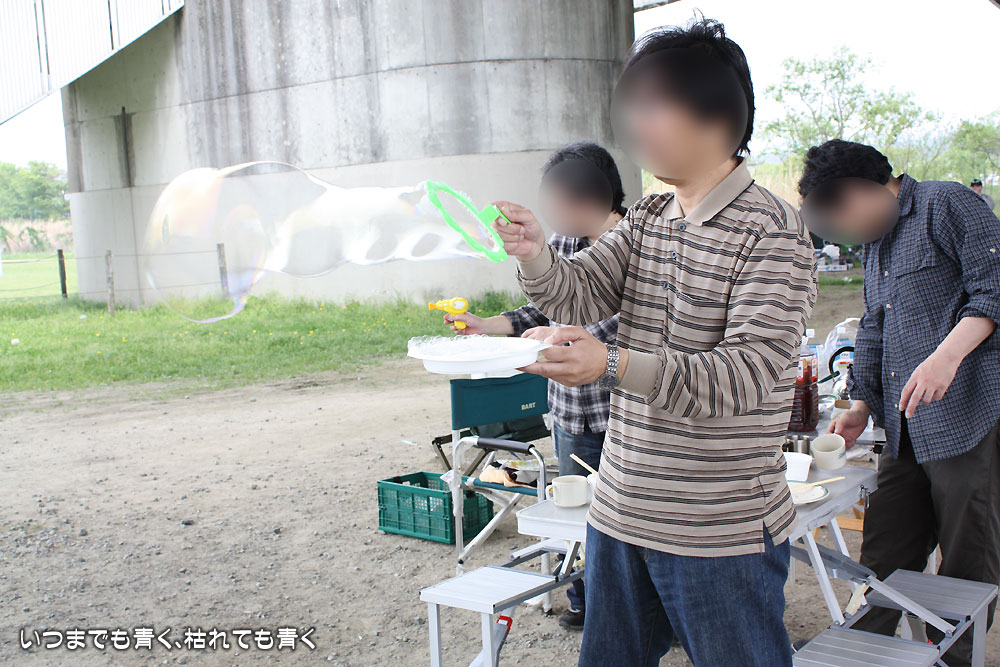 今回の食事の間の遊びは、しゃぼん玉です。つるちゃんが持ってきてくれました。さっそくやてみると、これが面白い。大きなしゃぼん玉が簡単にできてしまいます。ついつい夢中になってしまいました。いつものようにモデルガンでの遊びの準備をRollyさんにして来てもらいましたが、今回はまわりに人が多い中ということもあり、他の人から見れば顰蹙を感じる遊びは控えることにしました。
