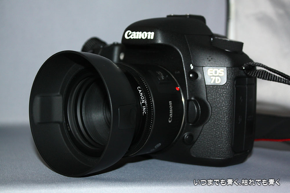 ![]() 今回買った50mm単焦点レンズとフード | ![]() EOS 7Dに装着 |