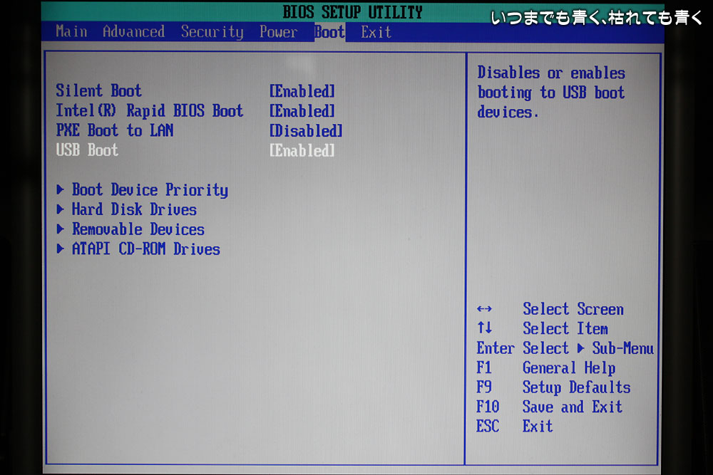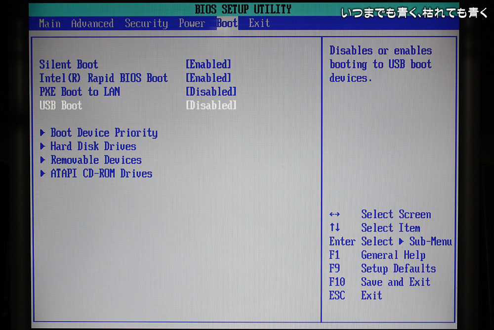 BIOS設定でまずやったのは、「USB Boot」を「Enabled」から「Disabled」に変更。