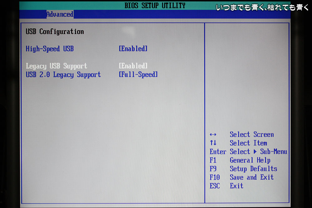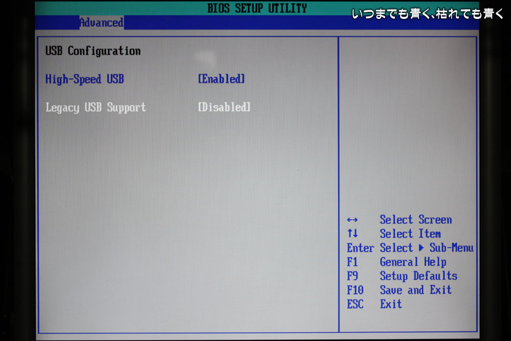 次は、「Legacy USB Support」が「Enabled」になっていたのを「Disabled」に変更。この変更はUSB接続のマウスやキーボードを使っていると、BIOS画面でキーボードが使えなくなりますので、USB接続のキーボードを使っている場合は要注意です。私は、変換プラグを使ってPS/2接続していますので、問題はありません。