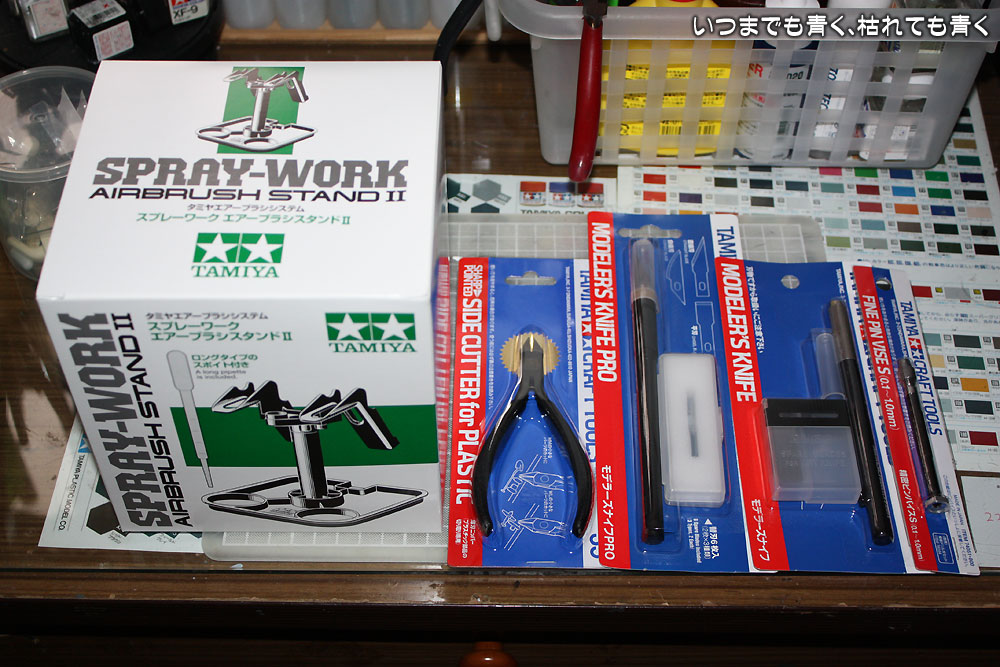左の写真は、タミヤのブースでの販売が3割引きだったので、欲しいとおもっていた工具をまとめて買ったものです。写真を撮り忘れましたが、この他にもスプレーワークHGコンプレッサーのエアチューブも買いました。