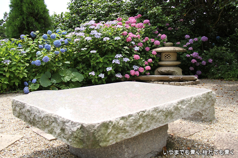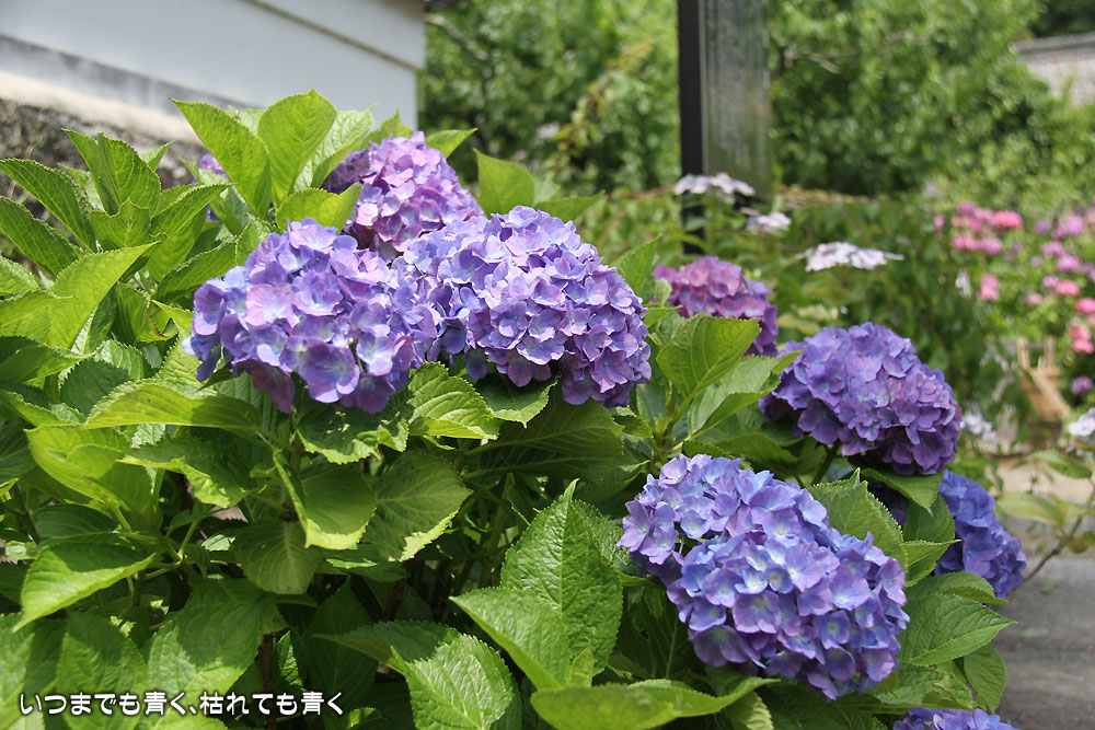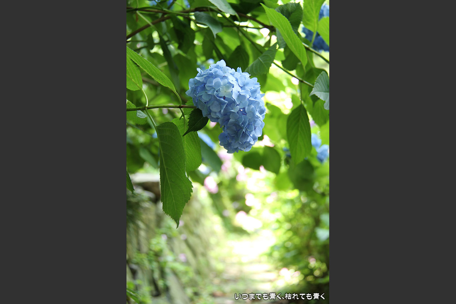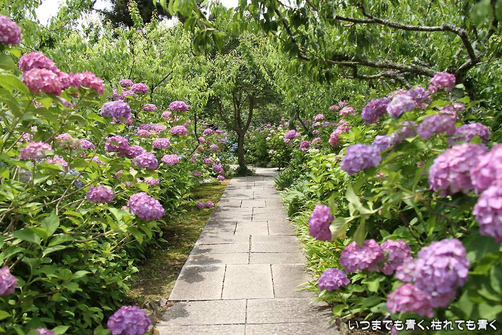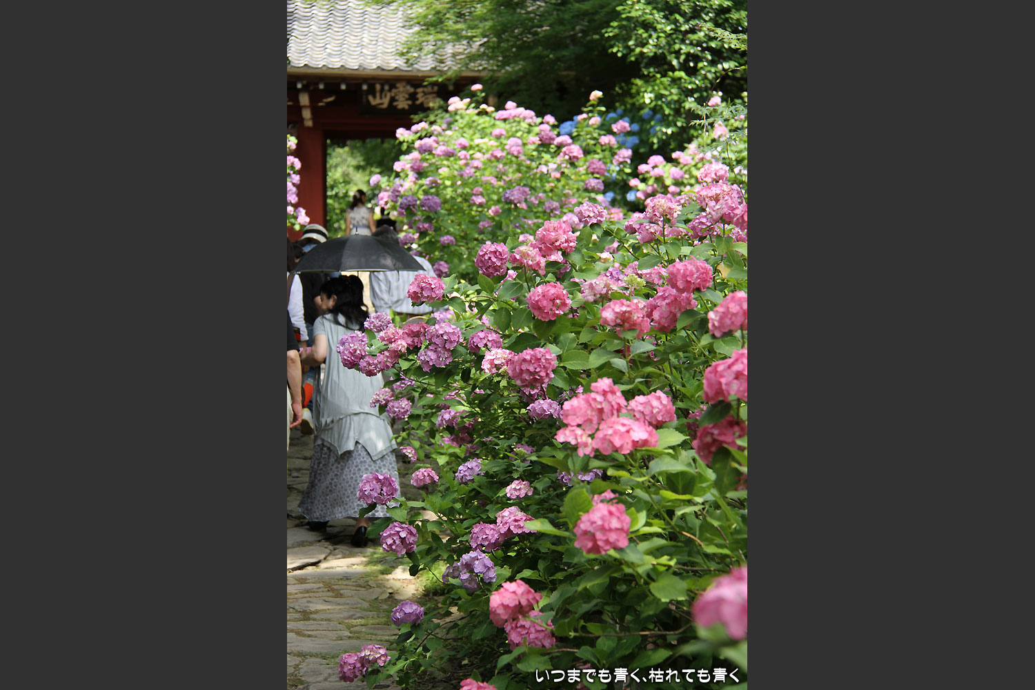 昨年に来た時は時折小雨の降る天気でしたが、今日は夜の雨があがり日が差す暑い日となりました。紫陽花は日光よりも雨の方が似合いますので、少し雨が降るくらいの曇り空の方が写真撮影にはいいのですけどね。天気が良かったせいか、今年は昼前に着いたにもかかわらず、駐車場に並ぶ車の列ですごい人でした。