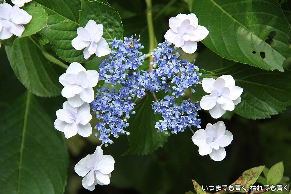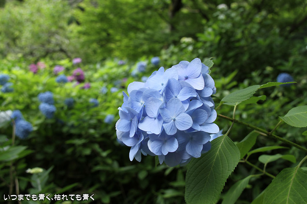 明月院ブルーと呼ばれる、やや明るめの透明感のある青色が特徴です。明月院は今回が3回目ですが、見頃を過ぎてしまっていた過去2回に比べると、今回は美しい姿を保っていてくれていました。個人的には濃い青の紫陽花が好きなので、明月院ブルーはちょっと物足りない感じがするのですが、清楚でさわやかな感じは大きな魅力です。明月院ブルーのヒメアジサイがほとんどを占めていますが、あずまやの前には色とりどりの山あじさいや園芸あじさいが植えられていて、違う雰囲気も楽しめます。