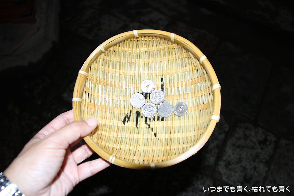 すでに5時を過ぎていましたので受付はしまっていましたので、参拝に来た人たちは、置いてあるざるを勝手に持っていって、御賽銭を出してお参りしたうえでお金を洗います。私も同じようにして、財布の中にある500円玉と100円玉をざるに入れて洗ったわけです。お札を洗っている人もいましたが、次に使うときにちょっと支障がでそうなので、私は硬貨だけにしたのですが・・・