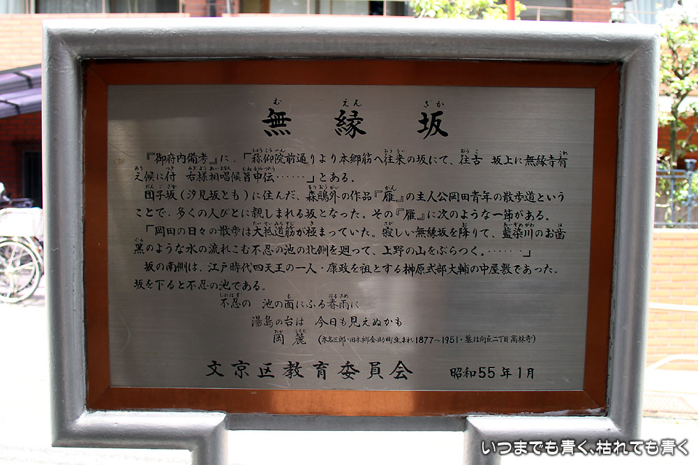 ![]() 無縁坂の坂名標 | ![]() 無縁坂の看板 |