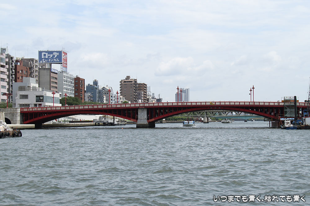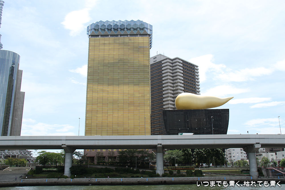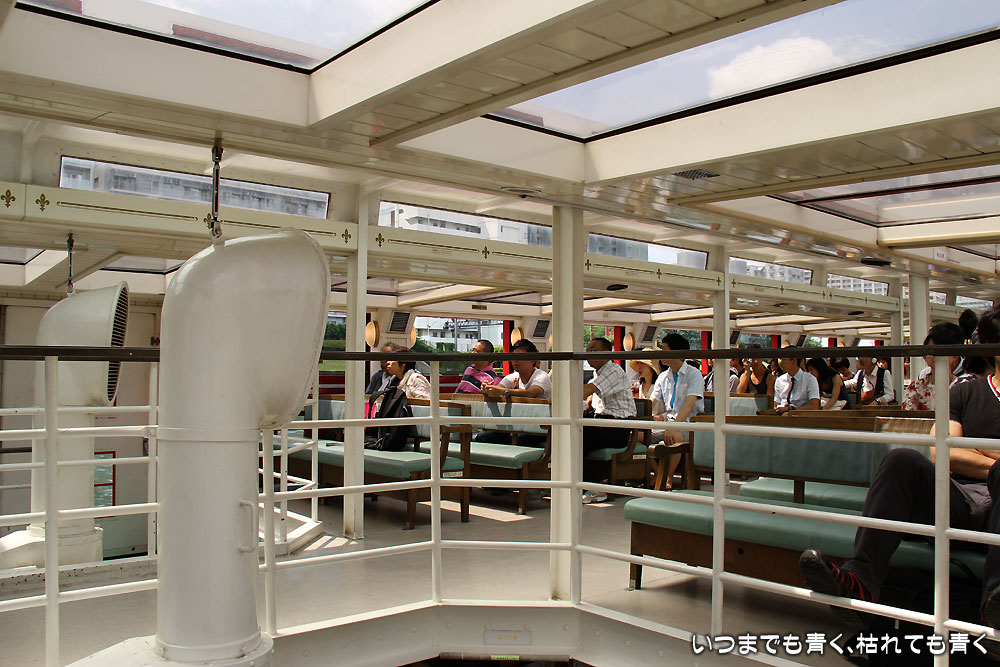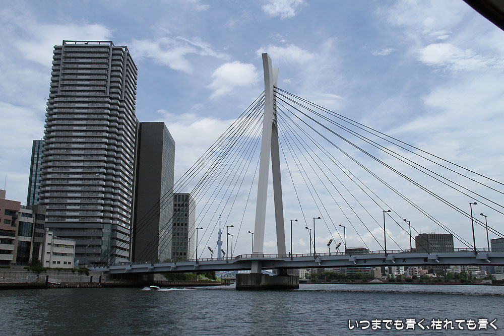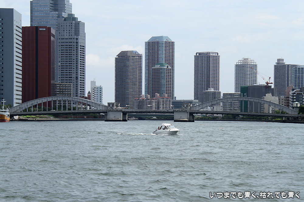 いくつかの種類の水上バスがあるようですが、私が乗った時間の水上バスは、定員560名の竜馬号という船。低い橋をくぐるために、背は低く屋根は真っ平らになっています。座席に座ってのんびりと隅田川の風景を眺めながらのクルーズもいいですが、私は船の前部に立ち、心地よい風を浴びながら風景と写真撮影を思う存分楽しみました。