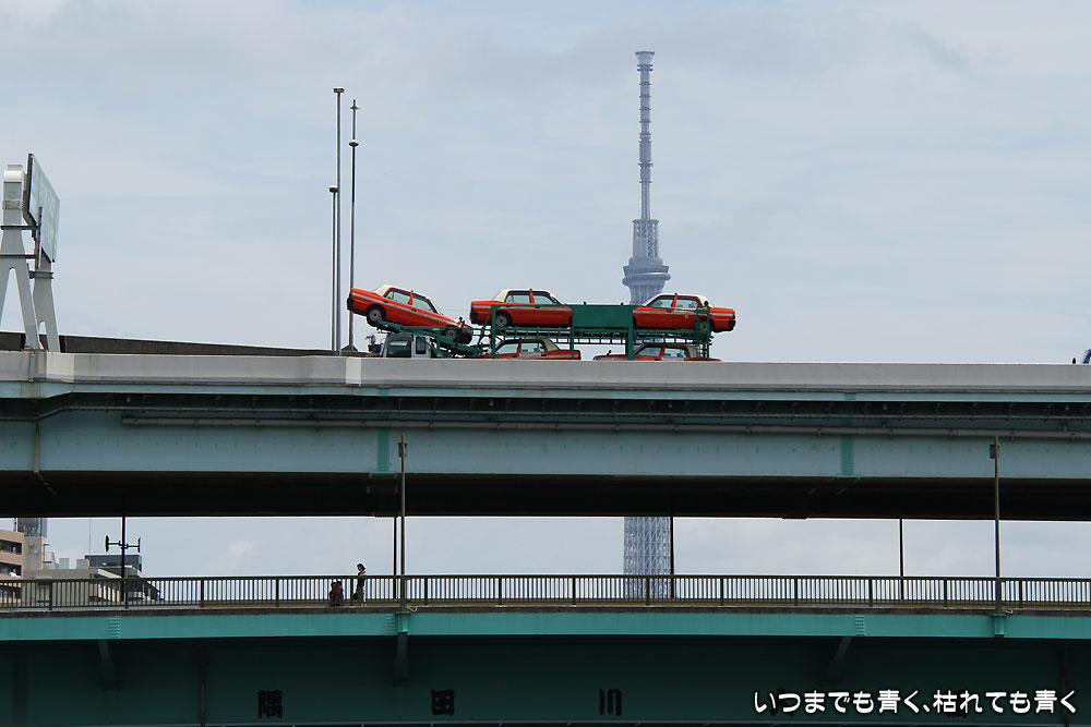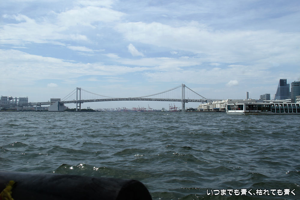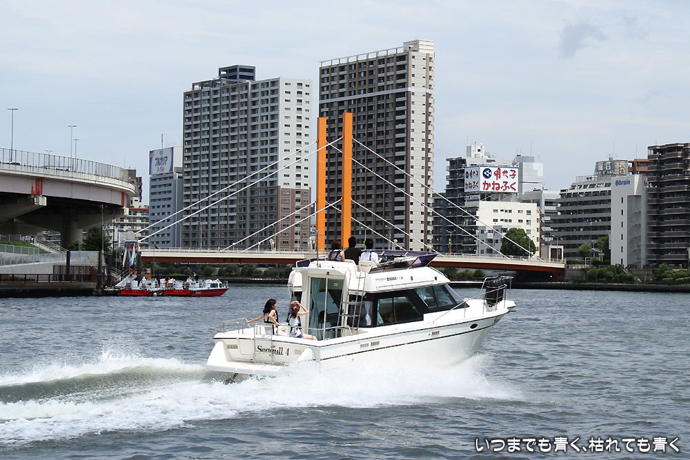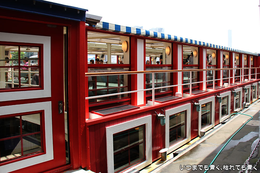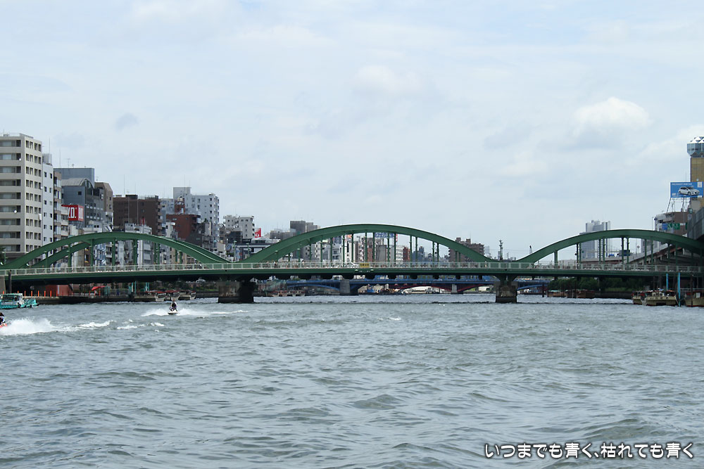 いくつかの種類の水上バスがあるようですが、私が乗った時間の水上バスは、定員560名の竜馬号という船。低い橋をくぐるために、背は低く屋根は真っ平らになっています。座席に座ってのんびりと隅田川の風景を眺めながらのクルーズもいいですが、私は船の前部に立ち、心地よい風を浴びながら風景と写真撮影を思う存分楽しみました。