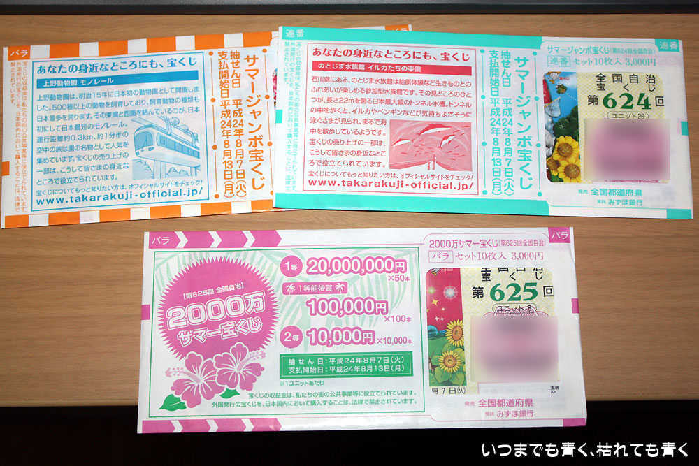 一回しか言わないから、ちゃんと聞いといてよ 日記/出来事 2012年7月27日(金) 19:55 「5円置くんじゃないんだよ。5億円。」 「ニセモンのサンマじゃないんだよ。2000万サマー。」 キムタクとジミー大西のCMにつられて買って来ました。 (私的には、このCMはツボです。) 昨年の年末ジャンボで当たった3000円をお金に替えて、それを軍資金の一部に。 では、しばらく良い夢を楽しみましょう。 ちなみに、5億円当たったら、コロッケとトンカツは買いますが、電柱は買いません。 ♪動画サイトの動画は削除されることがあります。