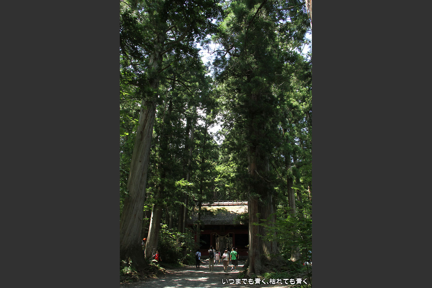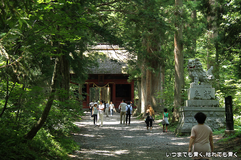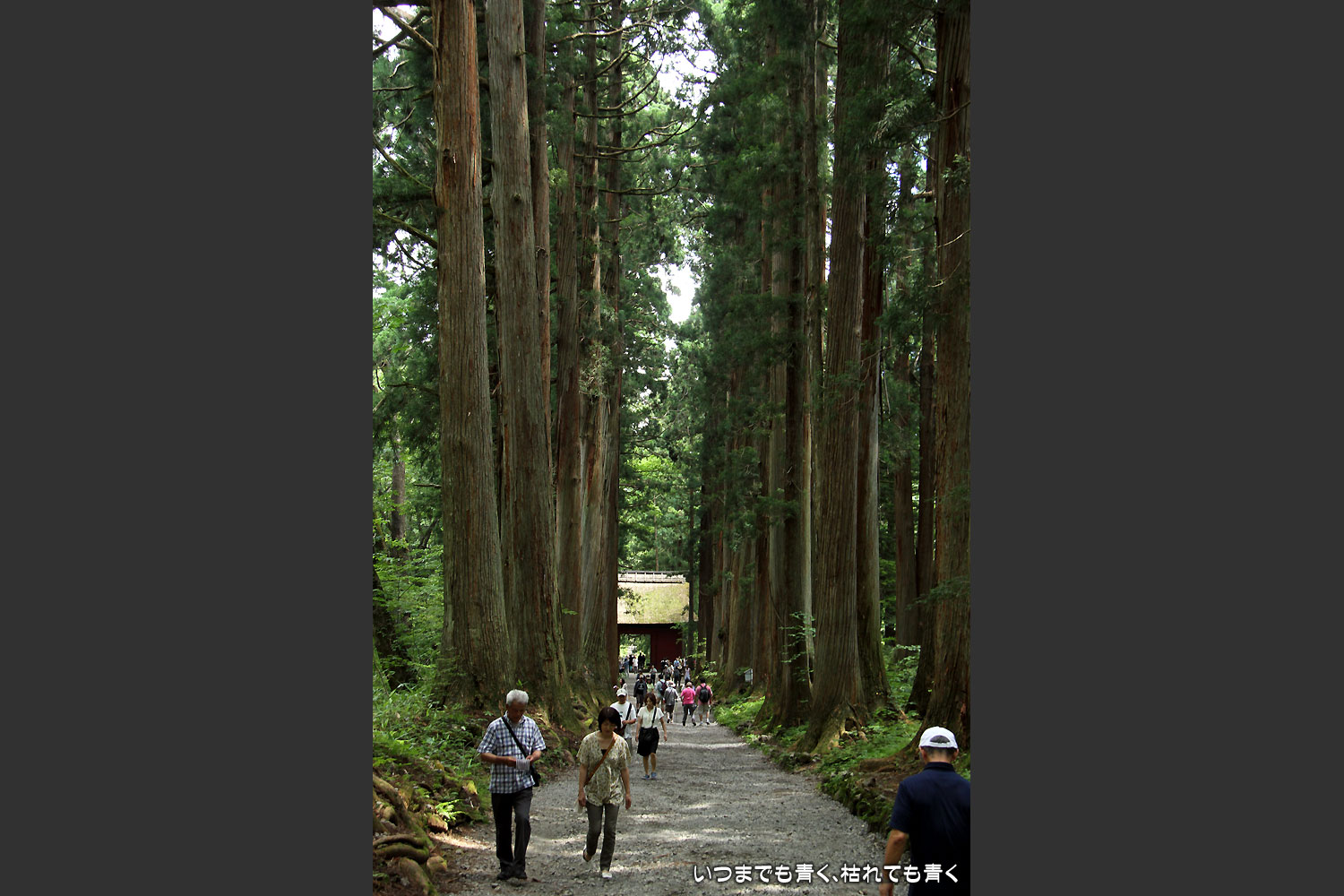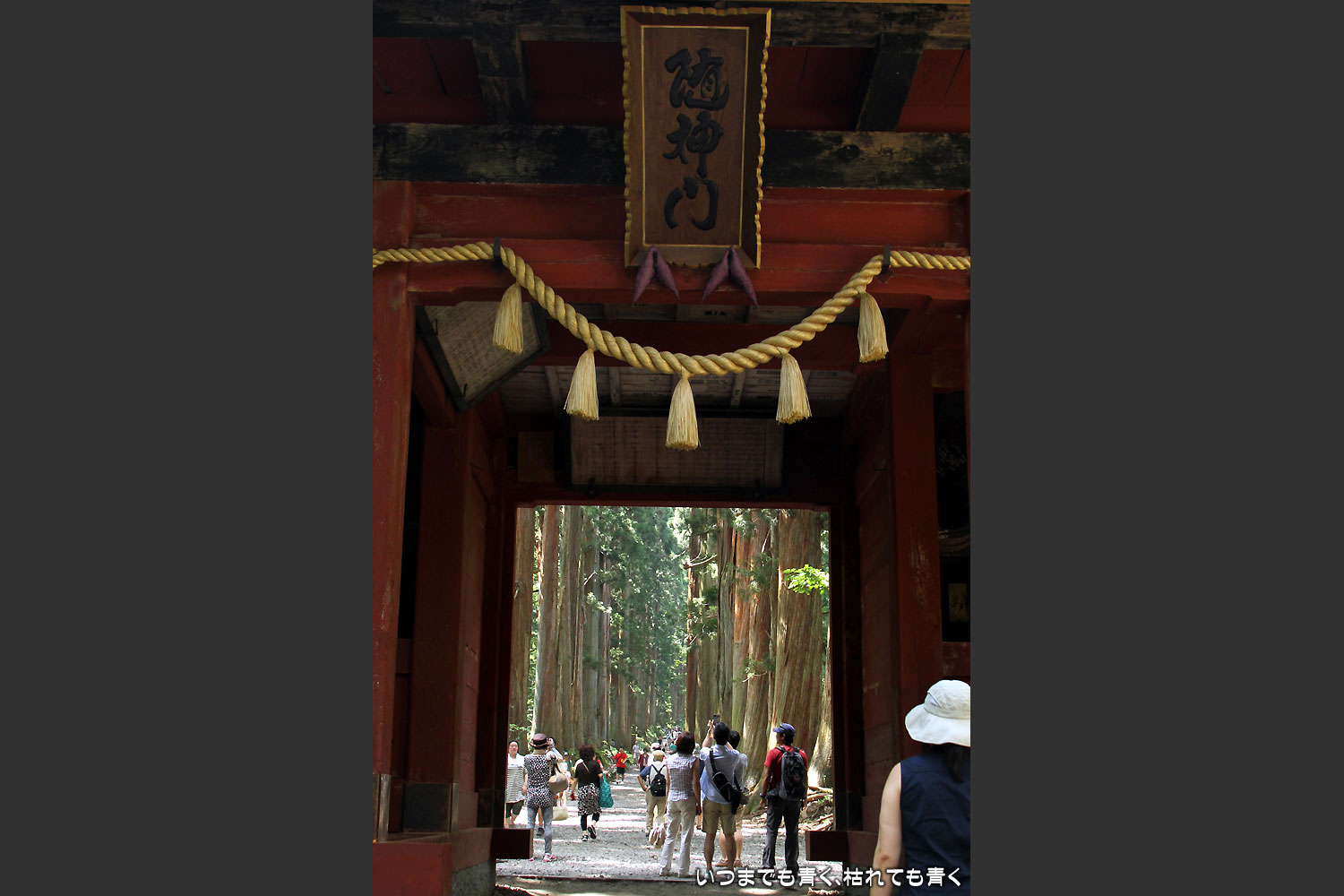 ![]() 随神門を通して見る杉並木 | ![]() 奥社参道杉並木、随神門(奥社側) |