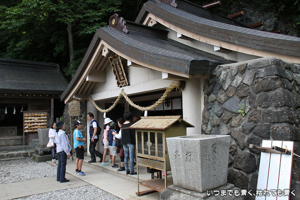 中社はすぐ近くに駐車場があり、奥社のようにお参りするのに時間はかかりません。中社の天井には、河鍋暁斎によって描かれた「龍の天井絵」があり、今回は脇の窓からしっかりとその絵を見る事ができました。また、中社の奥には滝があり、そこにもパワーがあるようです。ただ、今回は駐車場の鳥居から入ったために、大鳥居と三本杉を見ないまま戻ってしまったのがちょっと悔やまれます。
