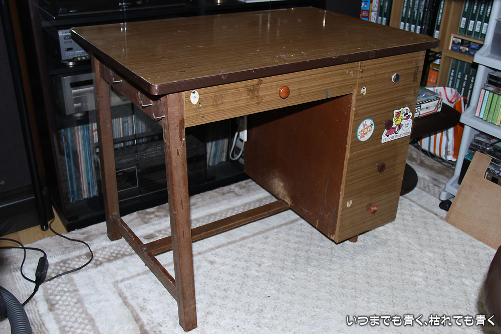 子供の頃にここで勉強したりマンガを書いたりした思い出深い学習机なので、これまで捨てられずにずっと使っていましたが、長女と次女はすでに学習机は放棄しましたし、末娘はお姉ちゃんのお下がりですし、どうも学習机なんかには子供たちは愛着は無いようです。今は愛着よりも使い勝手やデザイン優先の時代なんでしょうね。