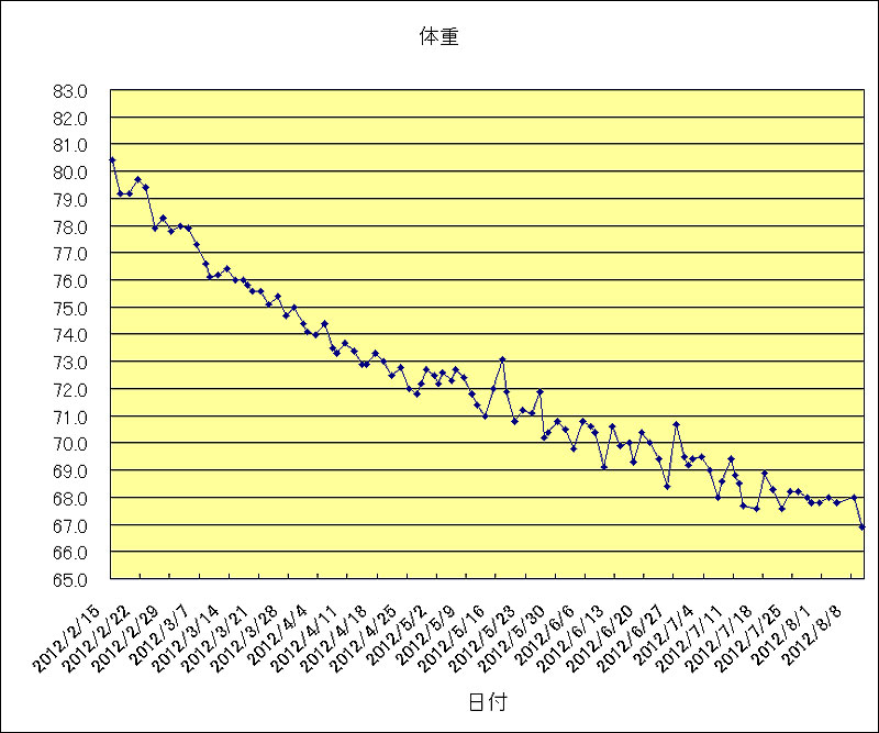 70kgを切ってからは、なかなか体重が思うように減りませんでしたが、とりあえず、半年以内の本日、目標の66kg台である66.9kgを記録することができました。