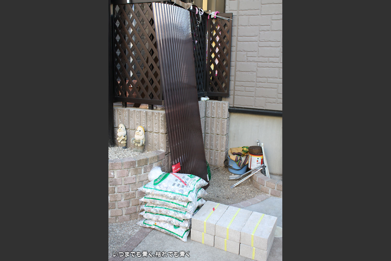 玉砂利は4袋で1平米ということだったので、予想通り全然不足。家の横だけでも半分も敷けませんでした。あと20袋以上は必要みたいです。ブロックレンガで区切りのイメージをつかむために並べてみましたが、ちょっと楽しむくらいのスペースは確保できそうです。波板は、うまくフェンスに取り付けられましたが、枚数があと3~4枚は必要です。徐々に資材を確保しながら形にしていきたいと思います。
