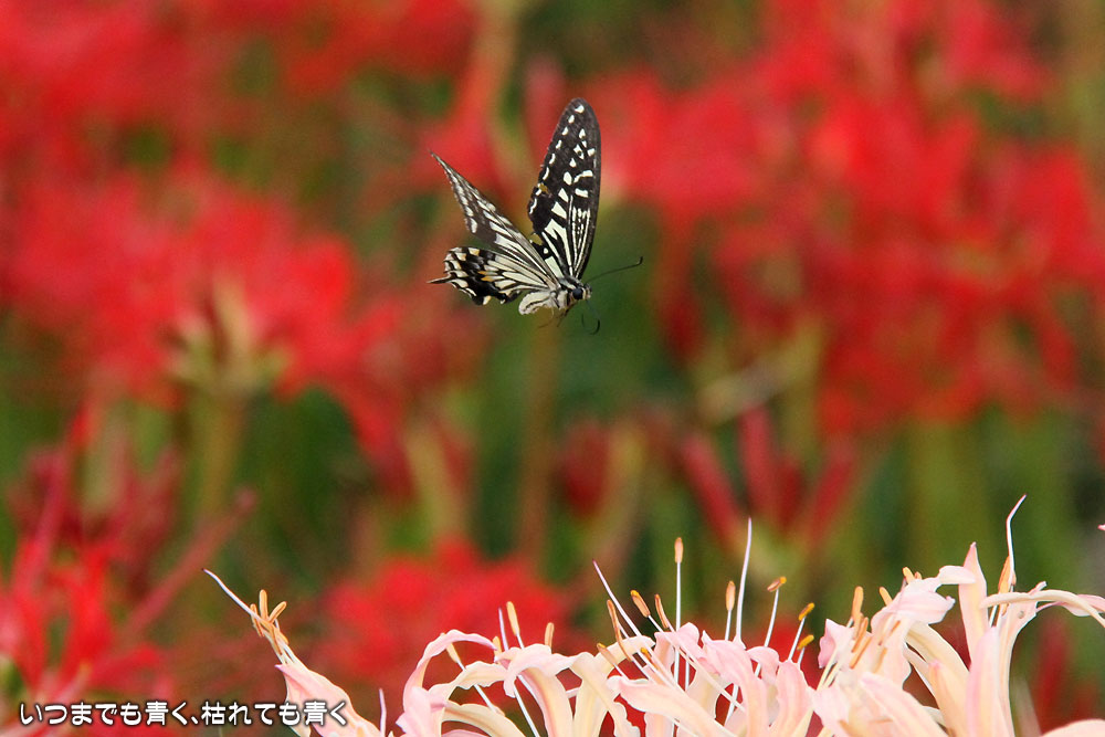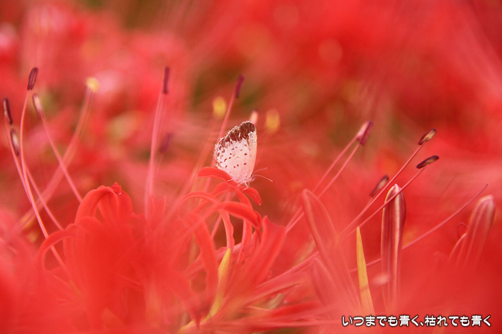 でも、何百枚も撮っても満足できるものは少ないですねぇ。ここでは個々の花よりも、「赤い絨毯」をうまく写しこめるかがポイントのようです。いい構図で撮影できたと思っていた写真も、よく見れば花に蜘蛛の巣がかかっていたり、額が汚く垂れ下がっていたりとか、べっぴんさんを選ぶところからミスっていることも多かったです。そういうこともあって、蝶々の力を借りた写真が多くなってしまっています。(^_^;)