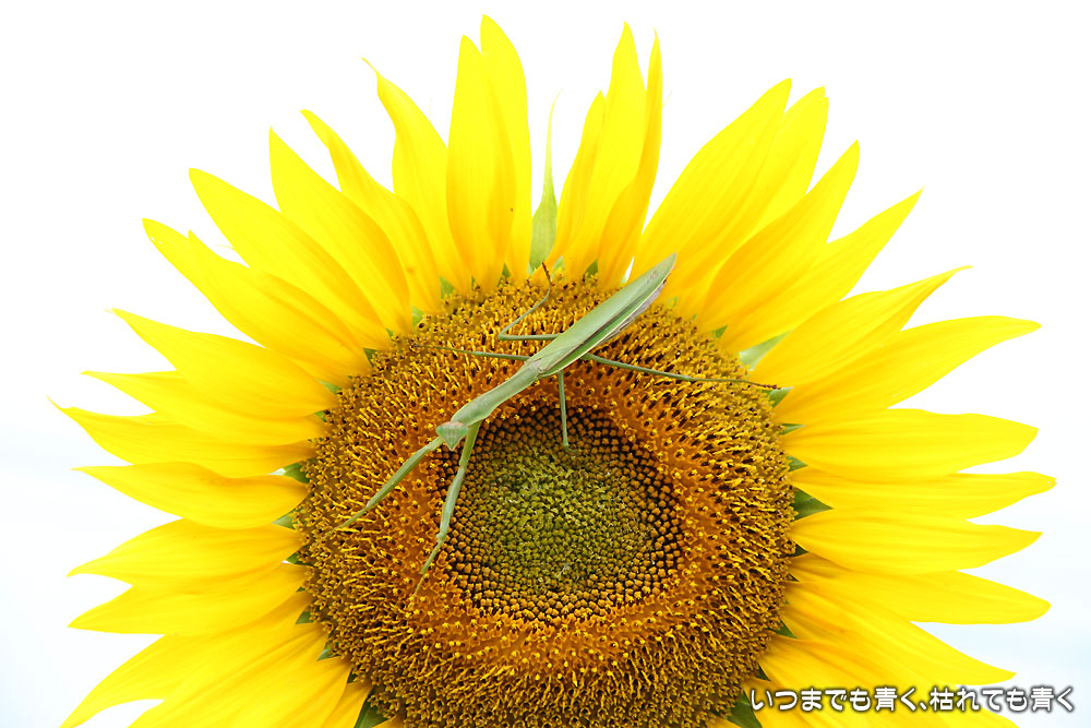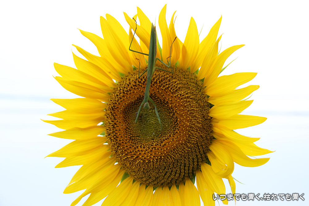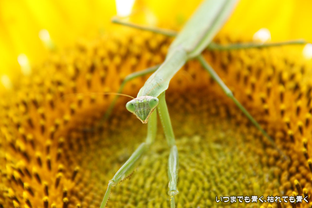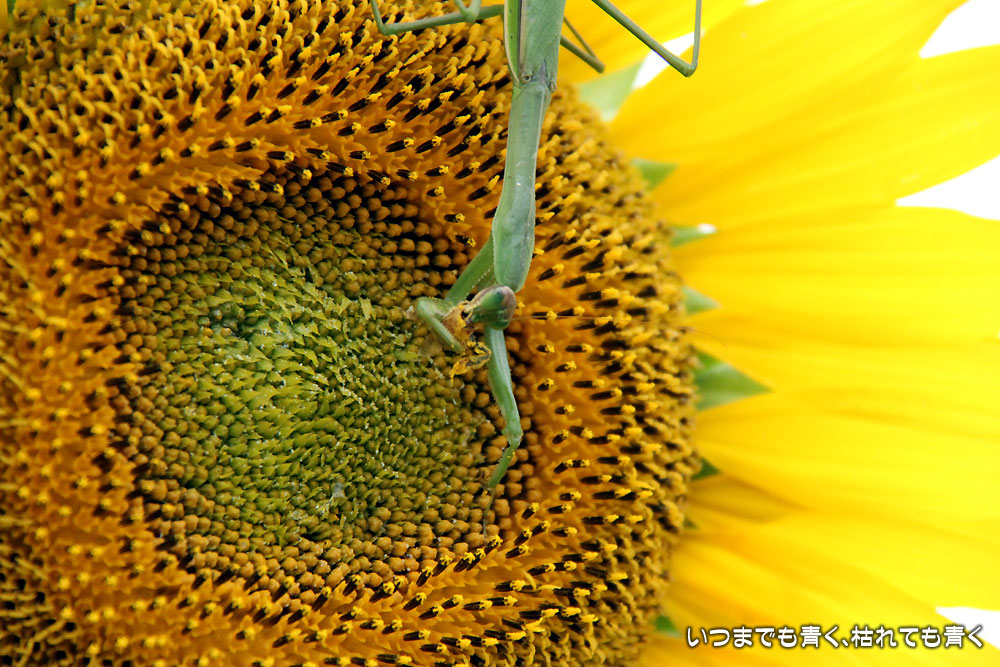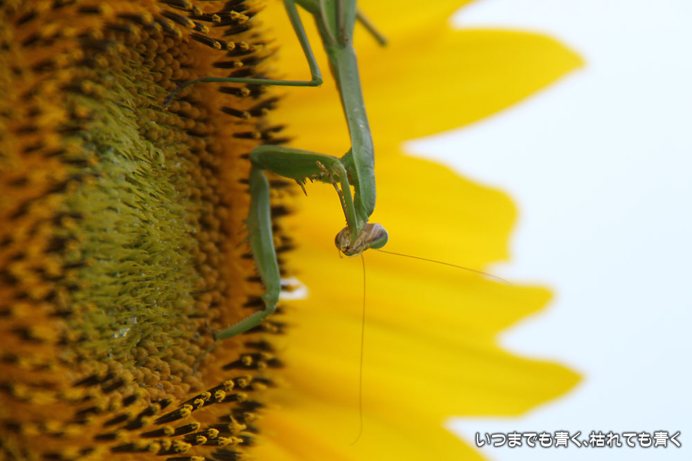 向日葵と蟷螂 ぶらりひとり旅 2012年10月6日(土) 21:47 10月の向日葵畑。 ほとんどの向日葵がうなだれて下を向いている中で、まだ空を向いている向日葵がチラホラ。 写真を撮ろうと思って正面にまわると、カマキリが向日葵の種を食事中。 その仕草や表情が可愛らしく感じて、撮影してしまいました。 虫嫌いな人には申し訳ありません。