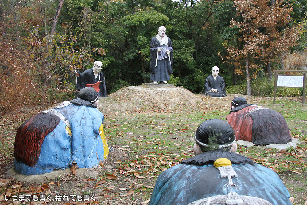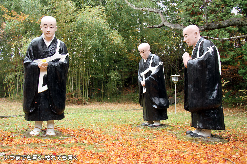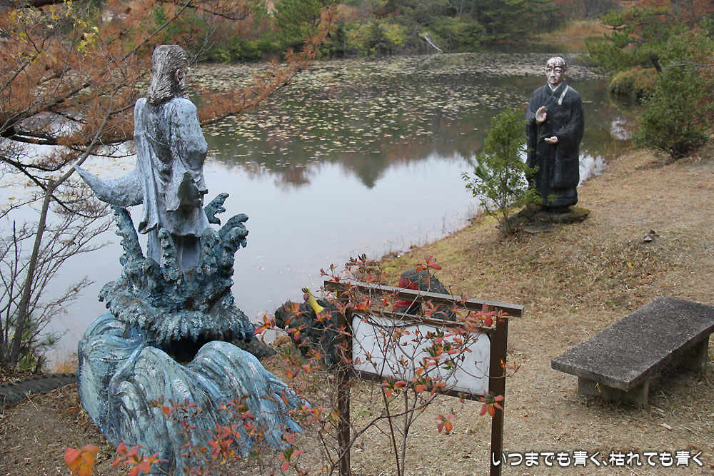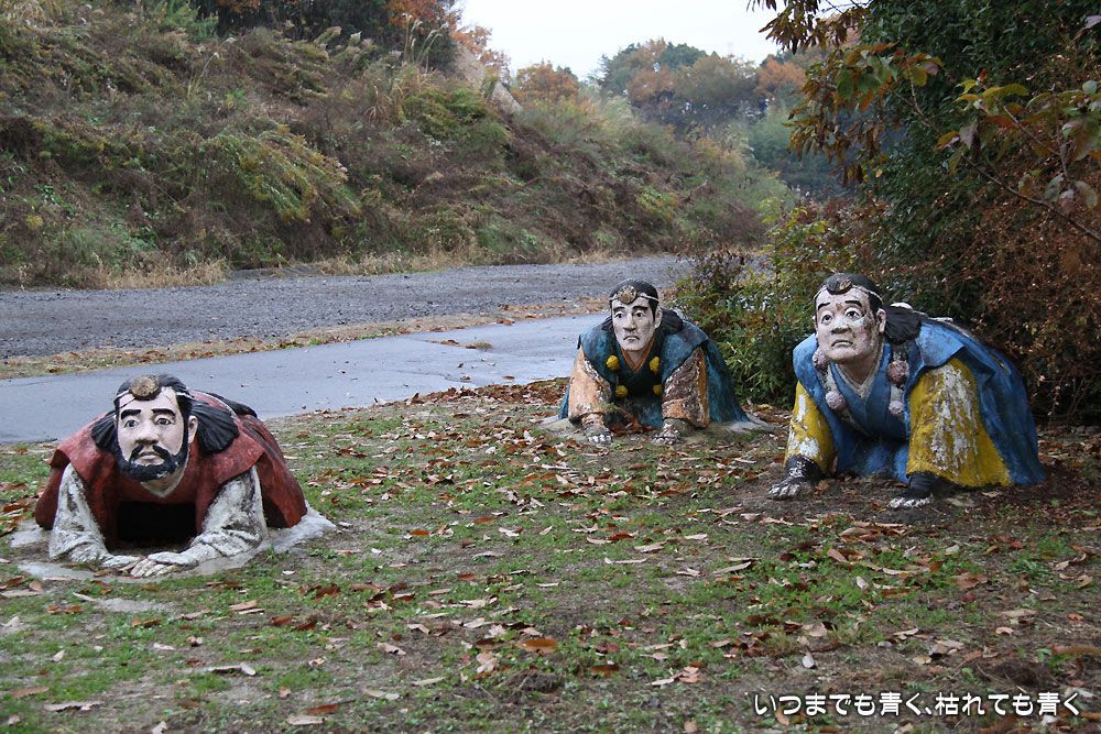 五色園は、2010年11月28日に初めて訪れ、そこにある人形の面白さに魅了されて、毎年出かけています。昨年は、2011年10月8日に家族と訪れ、今年も今日、家族と訪れました。紅葉が美しい場所にもかかわらず、人はほとんどいない場所。宗教施設とちょっと異様な人形のせいで、なかなか近づき難いのかも知れません。あいにく霙交じりの雨が降るとても寒い天候でしたが、今日は初めてすべての人形を確認してくることができました。