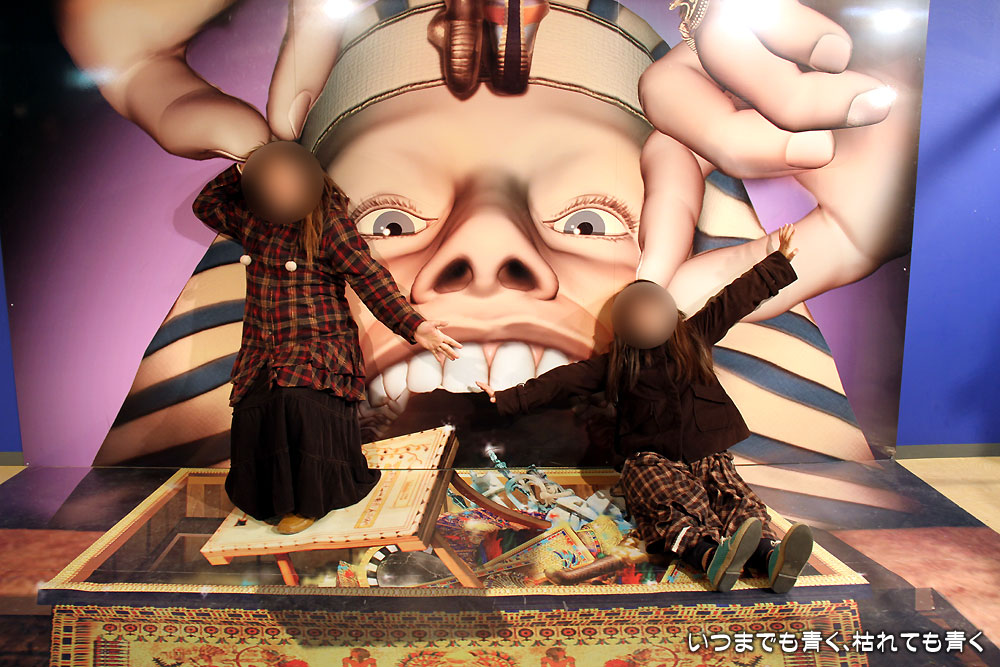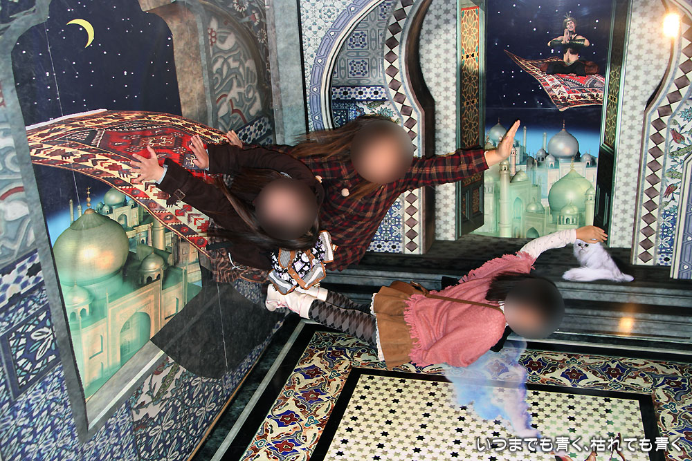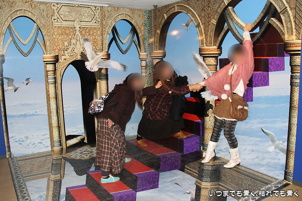 ただ、「サーカスの天井」という180度ひっくり返っているもの(今回掲載していません)や、90度傾いている「魔法のじゅうたん」というトリックアートの写真はポーズを撮るのが難しく、不自然な写真になってしまったのが残念でした。もう一度並んでリベンジしようかと娘たちに言いましたが、さすがにそれは大変ということで、うまく撮れなかったのも記念ということになりました。