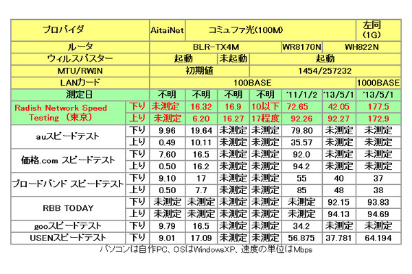 通信速度測定サイトで通信速度を測りましたが、測定サイトによって数値は大きく異なります。それでも、上下ともだいたい2倍くらいにはなっているようです。100Mbpsが1Gbpsになったのですから、もっと早くなってもいいと思うのですが、1Gbpsにもなると、測定サイトの能力やらボトルネックやらで正確なスピードは測定しにくいのかも知れません。