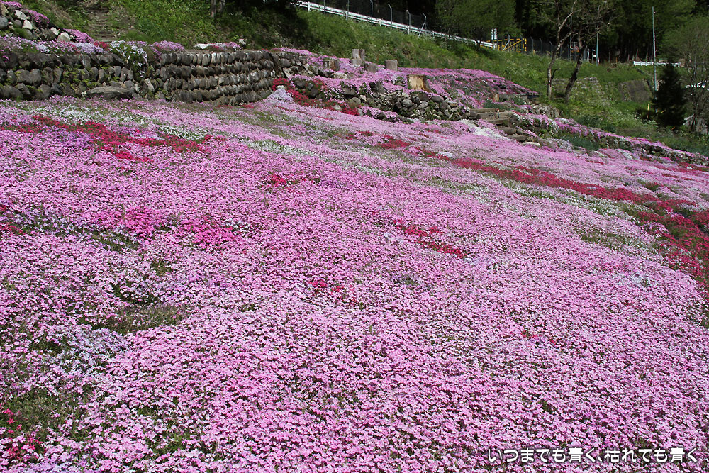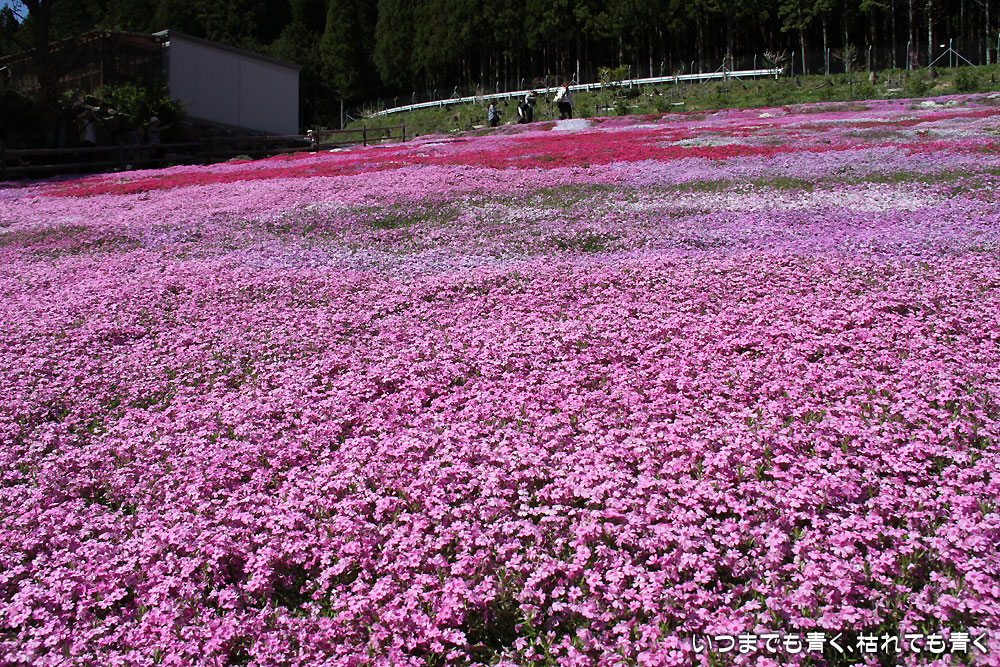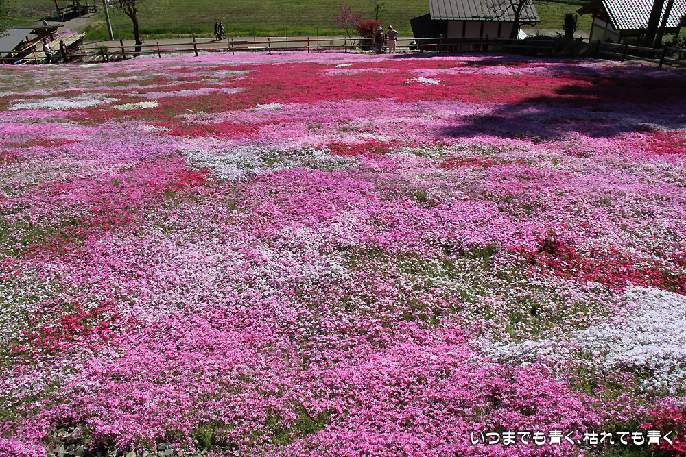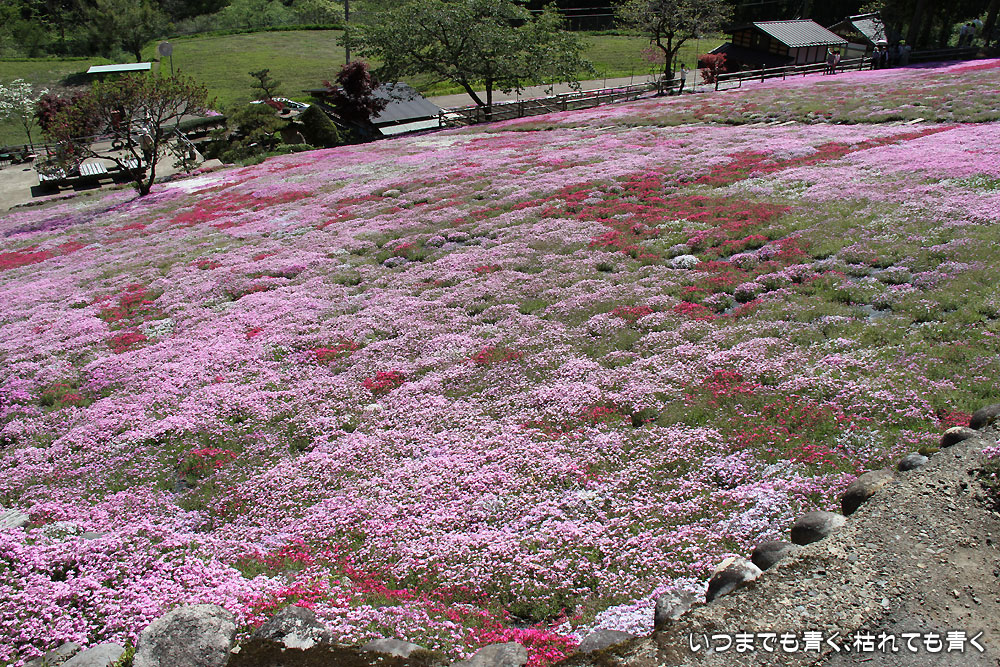 見頃は4月末からゴールデンウィーク中だということでしたので、ひょっとしたらもう鑑賞に値しないかもと思って出かけましたが、満開の時期は過ぎて一部は花よりも緑が目立つような状態ではありましたが、まだピンクや赤の絨毯を充分楽むことができました。4月末だと、満開の芝桜と、桜、水仙、チューリップとの競演も見られて、一層華やかで美しいらしいので、来年は見頃の時期に絶対に見に行こうと思います。