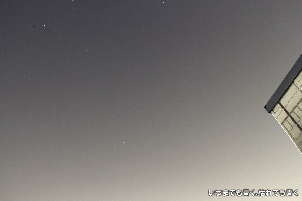 そういう条件でしたので、目で確認できた流れ星は1個のみ。カメラではとらえられるかもと思って、長時間露光で撮影を試みましたがまったく駄目でした。やはり自宅でペルセウス流星群楽しもうなんてことは甘い考えだったみたいです。2011年12月のふたご座流星群は自宅屋上でけっこう楽しめたのですけどね。