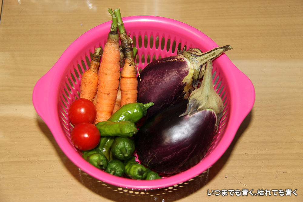 夏の終わり 日記/出来事 2013年8月18日(日) 18:49 本日の裏庭の収穫。 野菜の元気さからみて、これが最後の収穫となりそうです。 夏季連休も今日で終了。 暑さはまだまだ続くと思いますが、気分的には今年の夏も終わりましたね。 これからは、日も短くなり、なんとなく寂しい感じがしないでもないです。 連休最終日は、これからレイトショーの映画を観にいって締めることにします。
