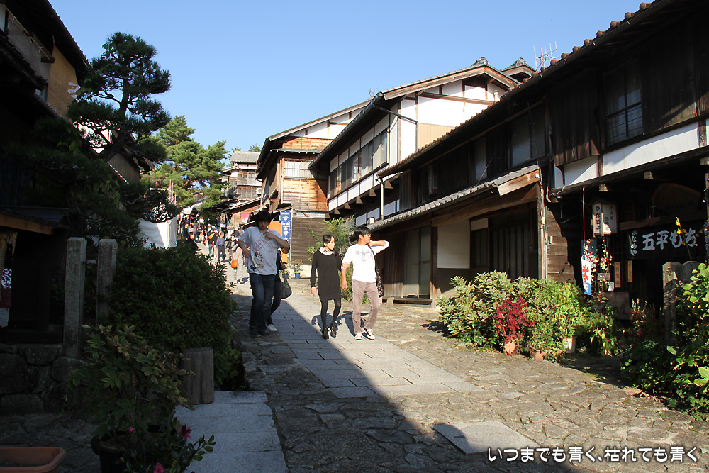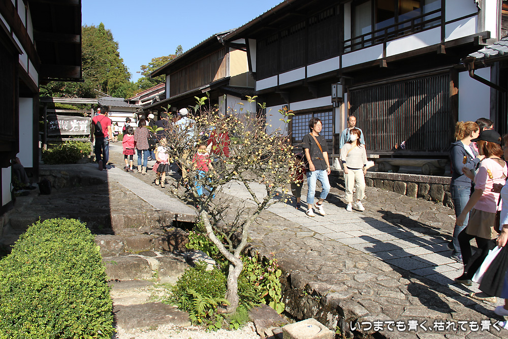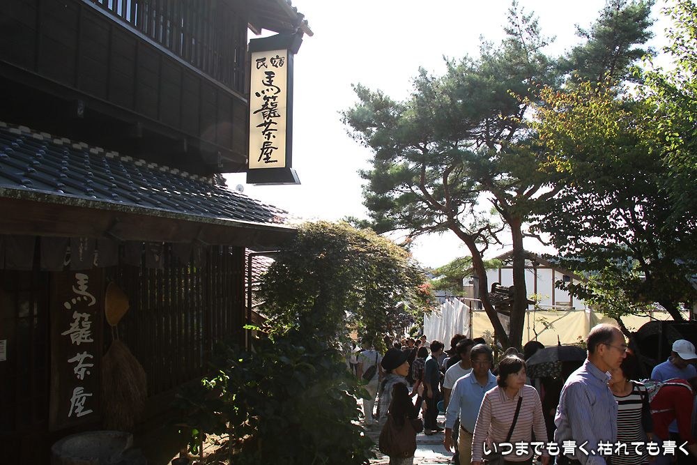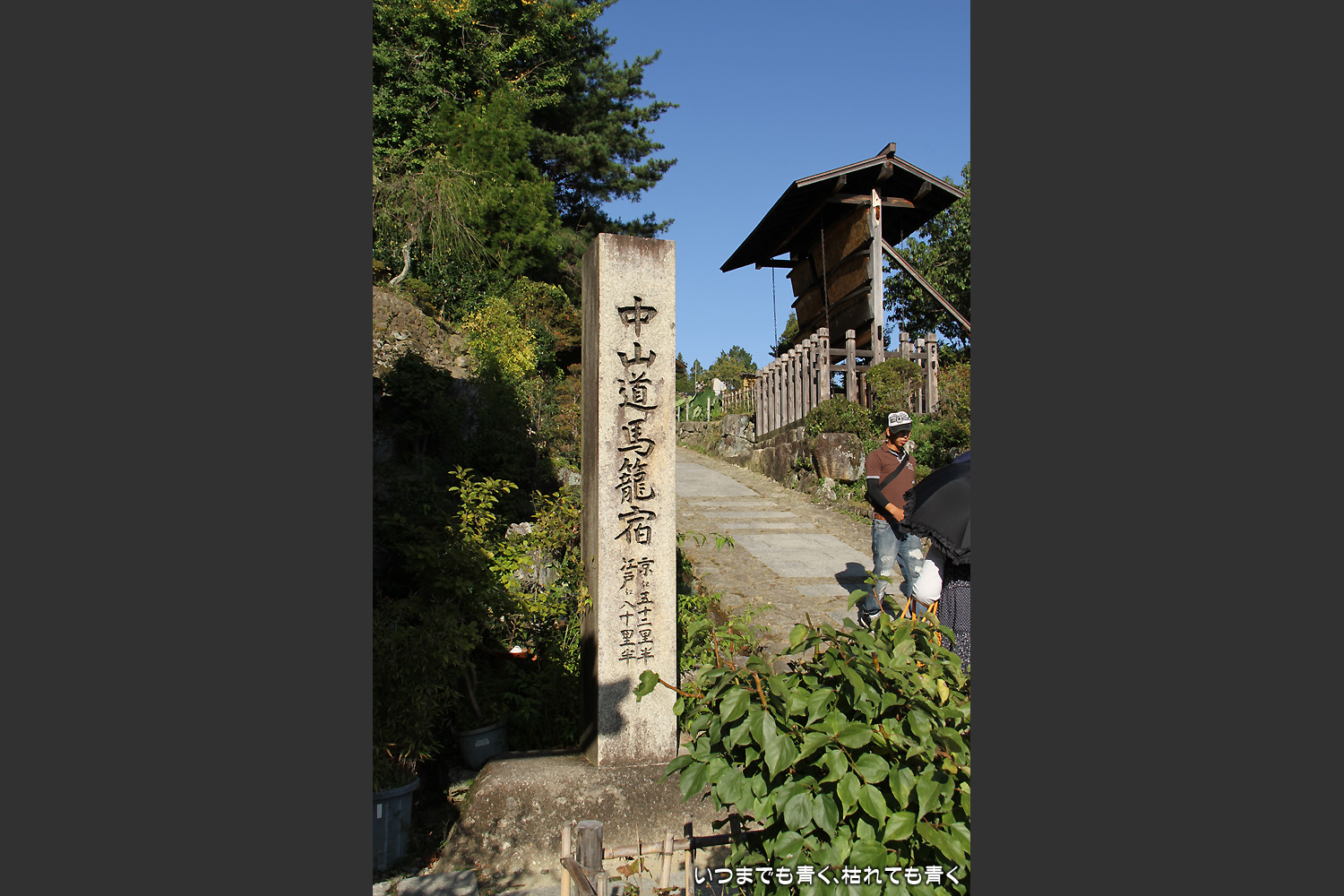 中山道木曽馬籠宿 ぶらり家族旅 2013年10月13日(日) 23:19 今日は、とても良い天気。その陽気に誘われて、奥さんと末娘と3人で木曽の山の中、馬籠宿をのんびりと歩いてきました。 木曽路の街道は、思っていたよりも細い石畳の坂道で距離もそれほどでもありません。道の両側には古いたたずまいの建物のお店が連なり、たくさんの観光客でとても賑やかです。思っていた旧街道の雰囲気とはちょっと違っていましたが、古い建物や木曽の山々をのんびりと眺めれば、とても落ち着いた気持ちになれました。