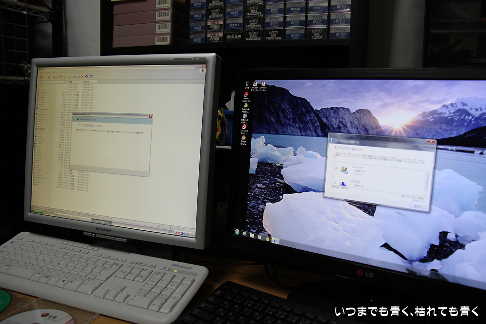 さっそく、セットアップし、ドキュメントフォルダの移行、メールの移行を完了しましたが、アプリケーションのインストールなど同じ環境にするのには、まだまだ大変そうです。幸いにもウィルスバスターのライセンスに余裕があったので、しばらくは新旧2台をネットワークに接続し使っていくつもりです。両方ネットワークにつなげていると、Windows転送ツールでネットワーク経由でハードディスクの内容を移せるので便利です。(右の写真)
