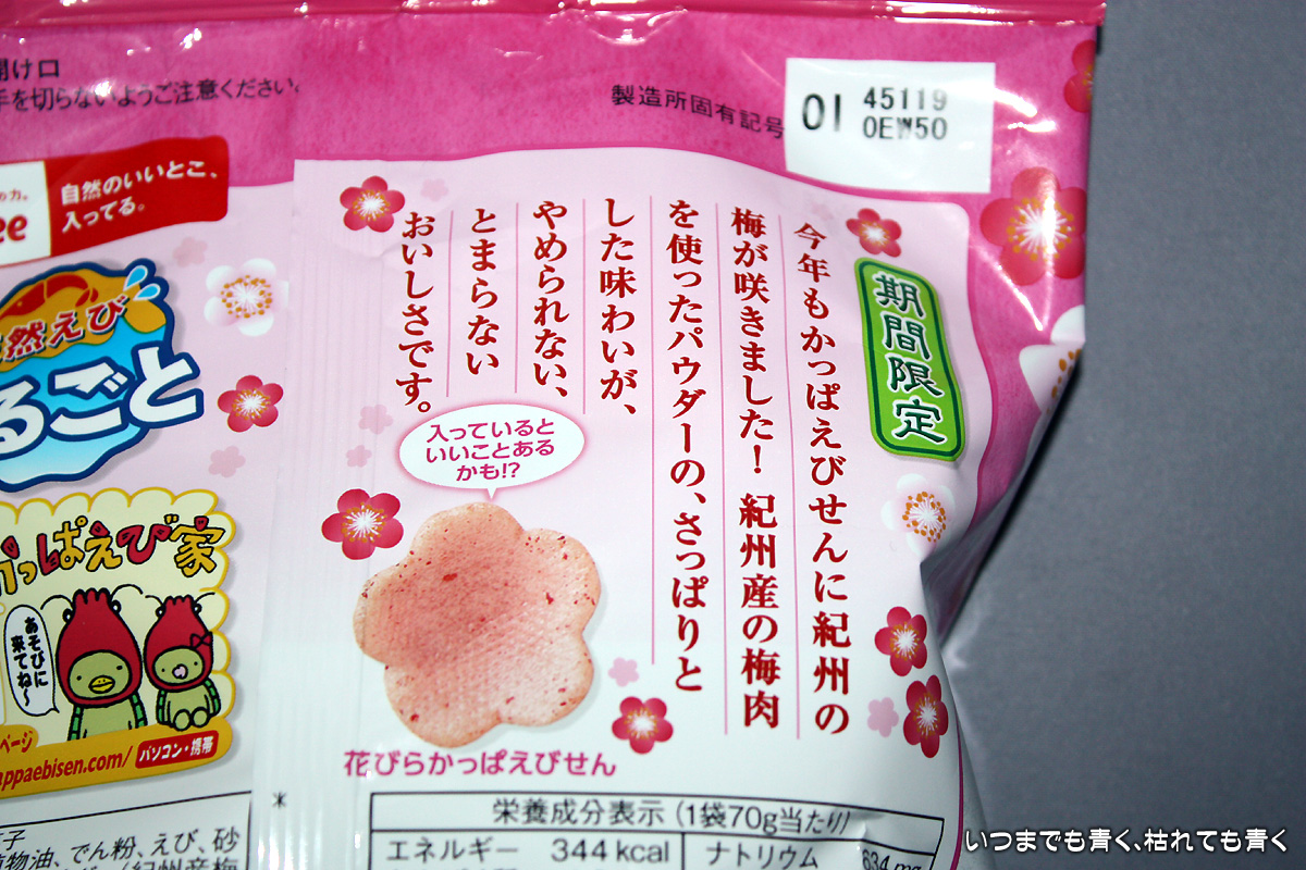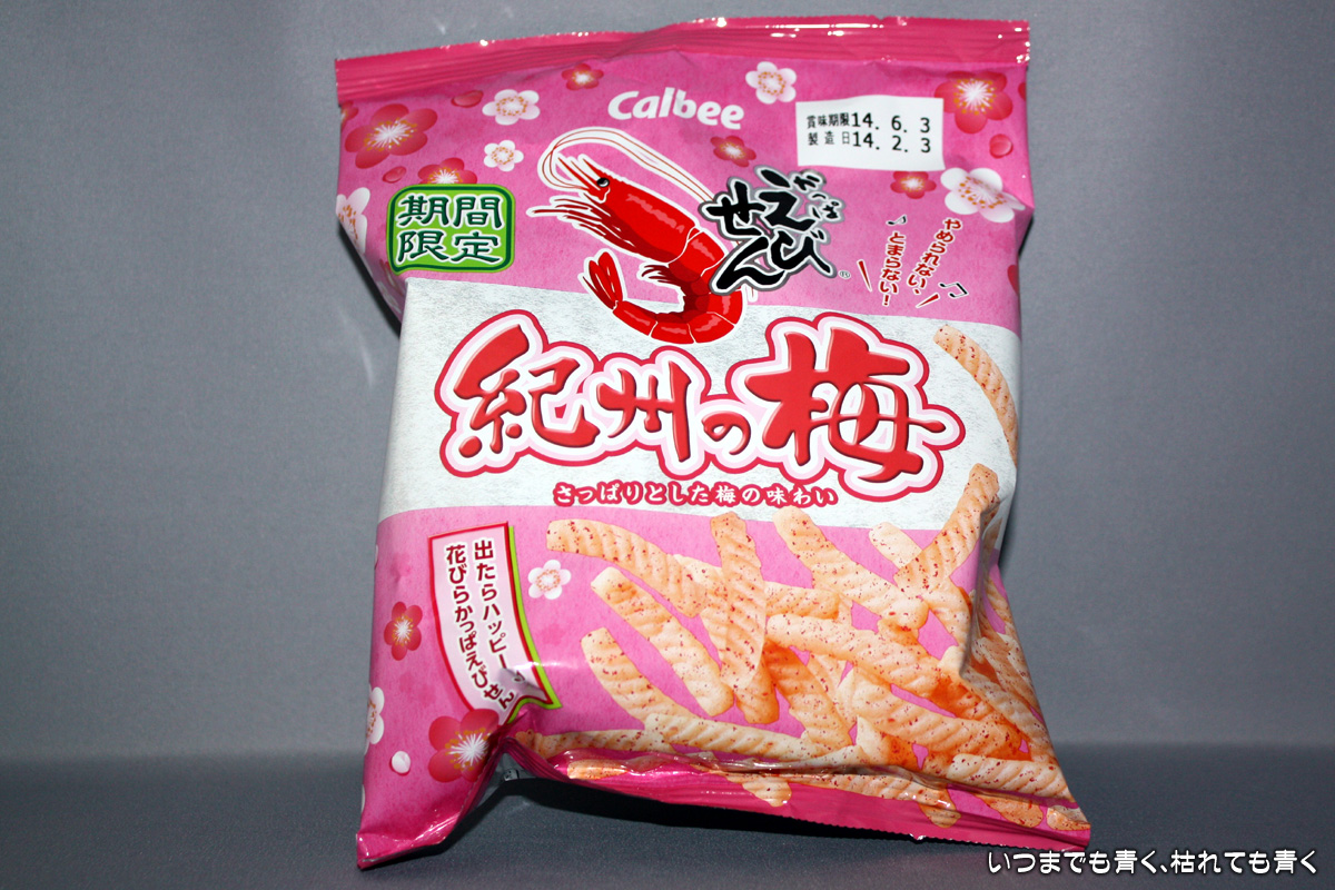 「えびせん紀州の梅」の季節 日記/出来事 2014年2月23日(日) 22:17 今年も「かっぱえびせん紀州の梅」の季節になりました。 梅肉パウダーがくせになって、やめられません、とまりません。 今年は3袋目で「花びらかっぱえびせん」に出会えました。