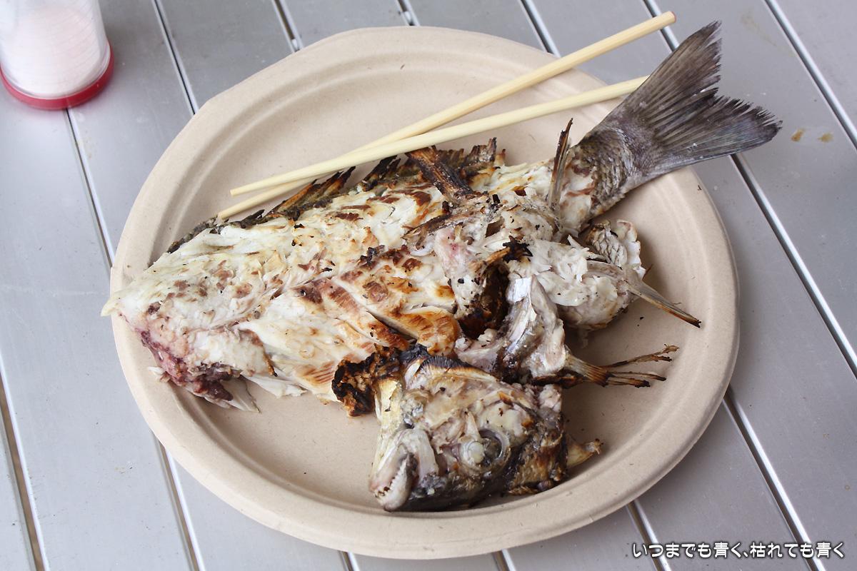 ![]() 雨天にもかかわらずいつもの場所は大盛況 | ![]() クロダイの丸焼き |