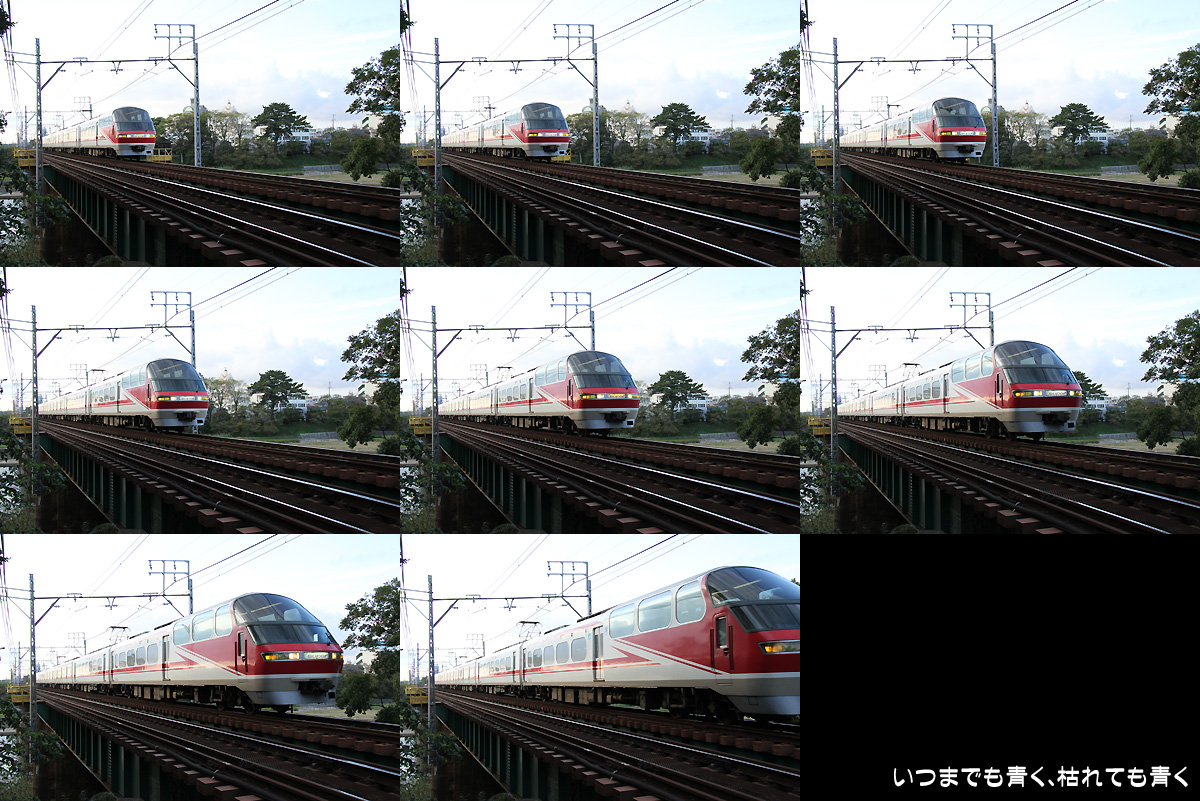 下の写真は、昨日名鉄電車を撮影した時のもの。このケースでは8コマ連写しています。私の愛機EOS 7Dの連写性能は最高8コマ/秒で、この時のシャッタースピードが1/1000秒とかなり高速なので、ほぼ1秒間の動きをとらえていると言っていいと思います。
