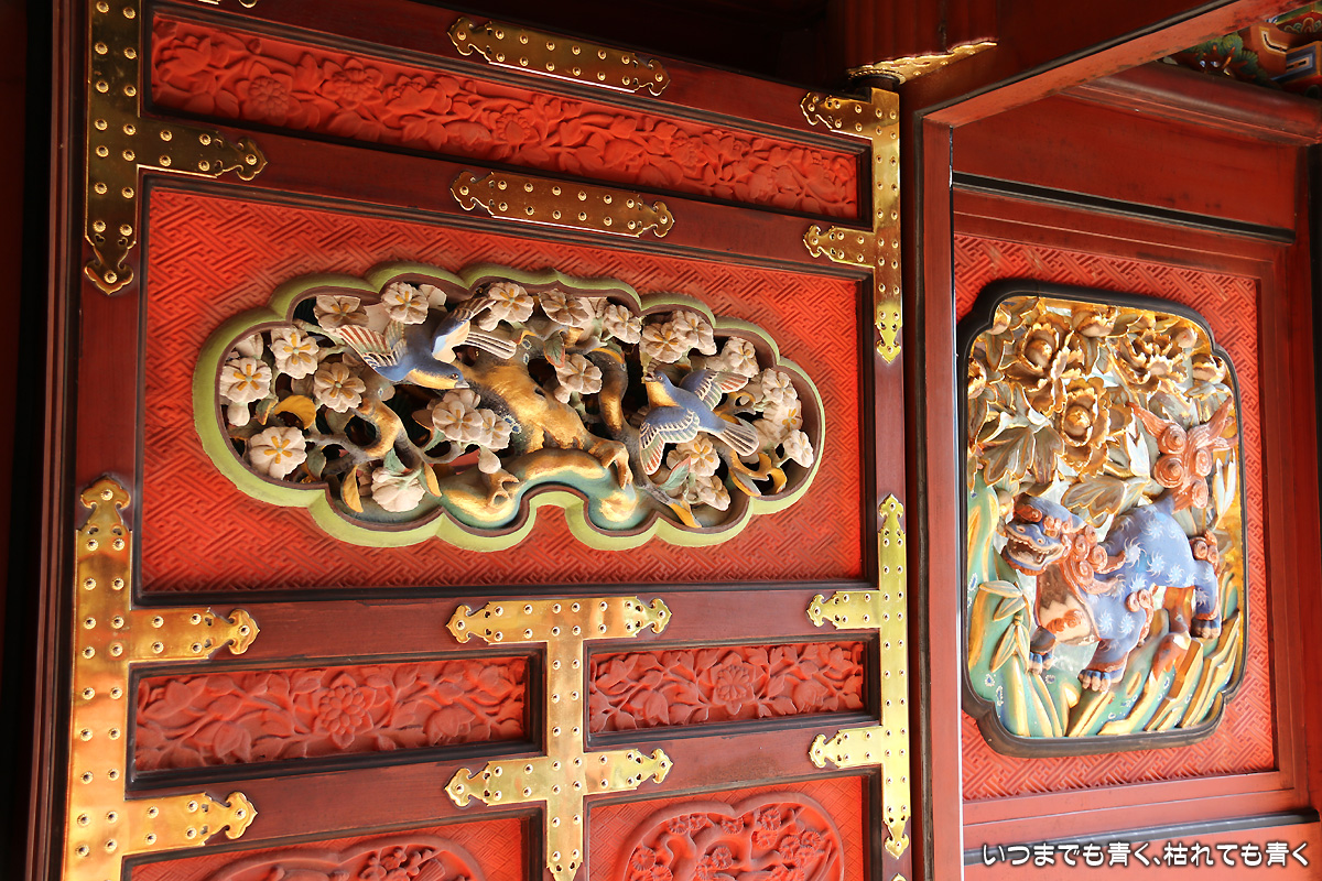 ![]() 社殿 | ![]() 唐門の彫刻 |