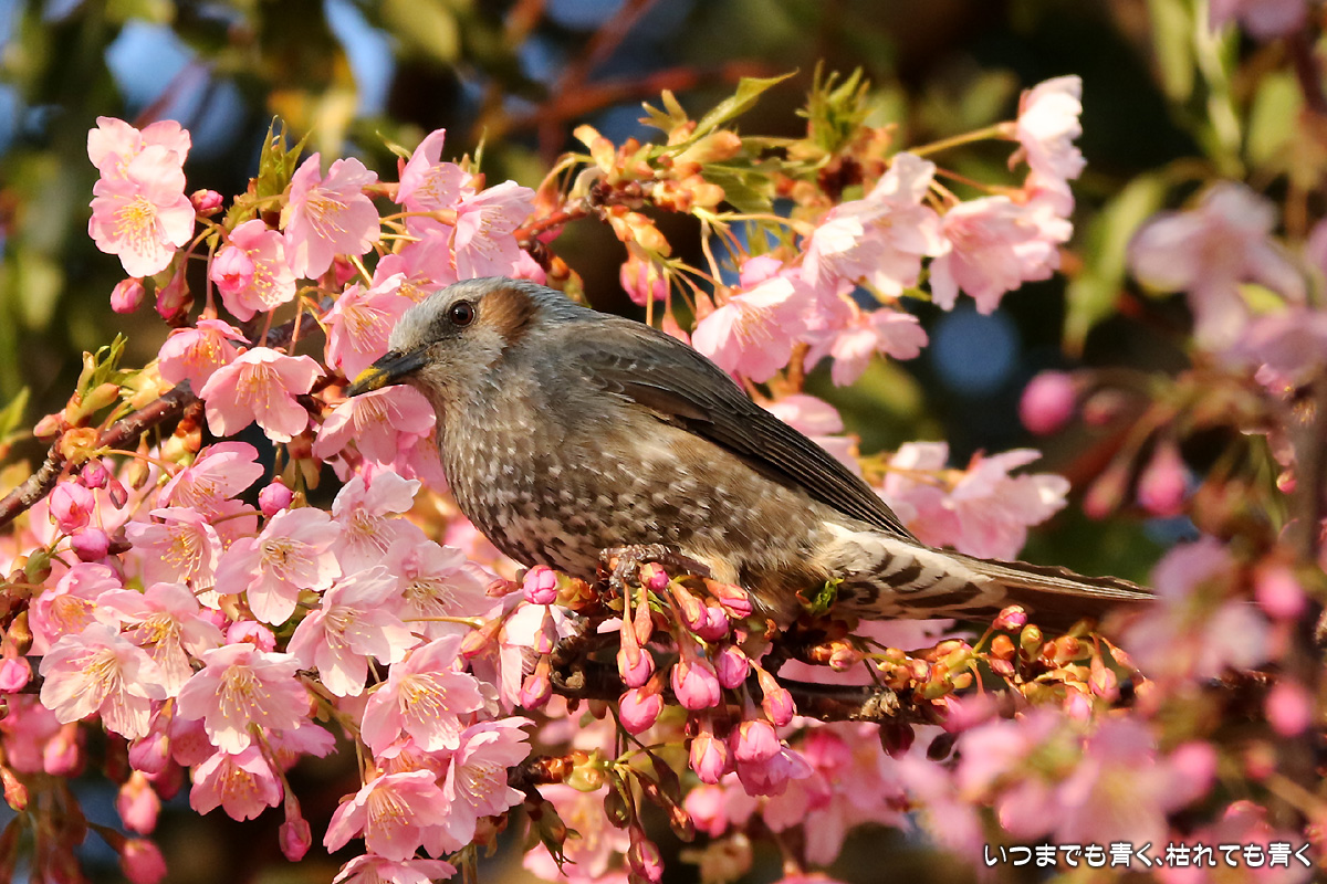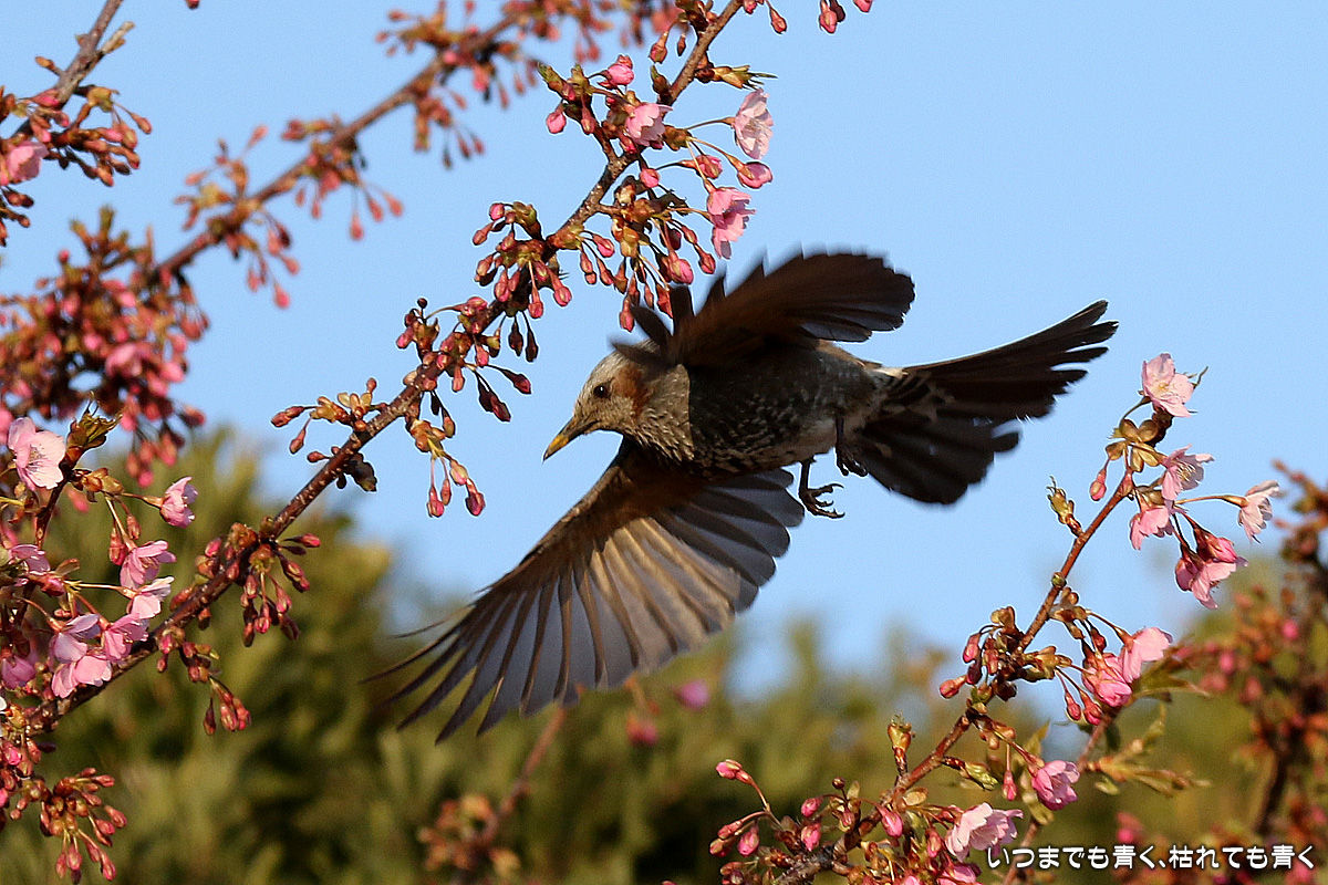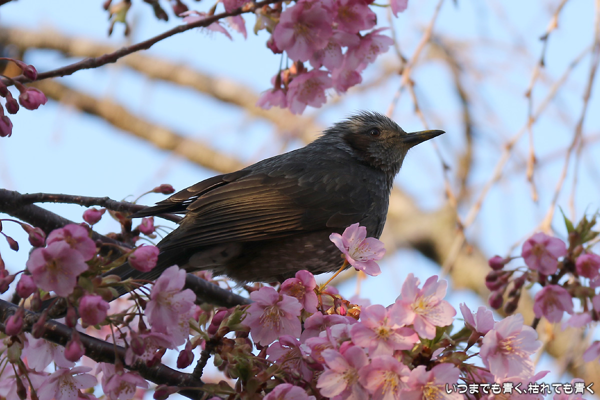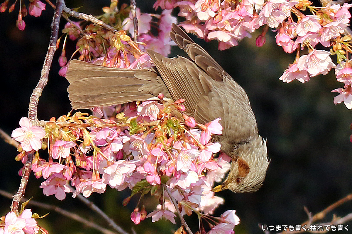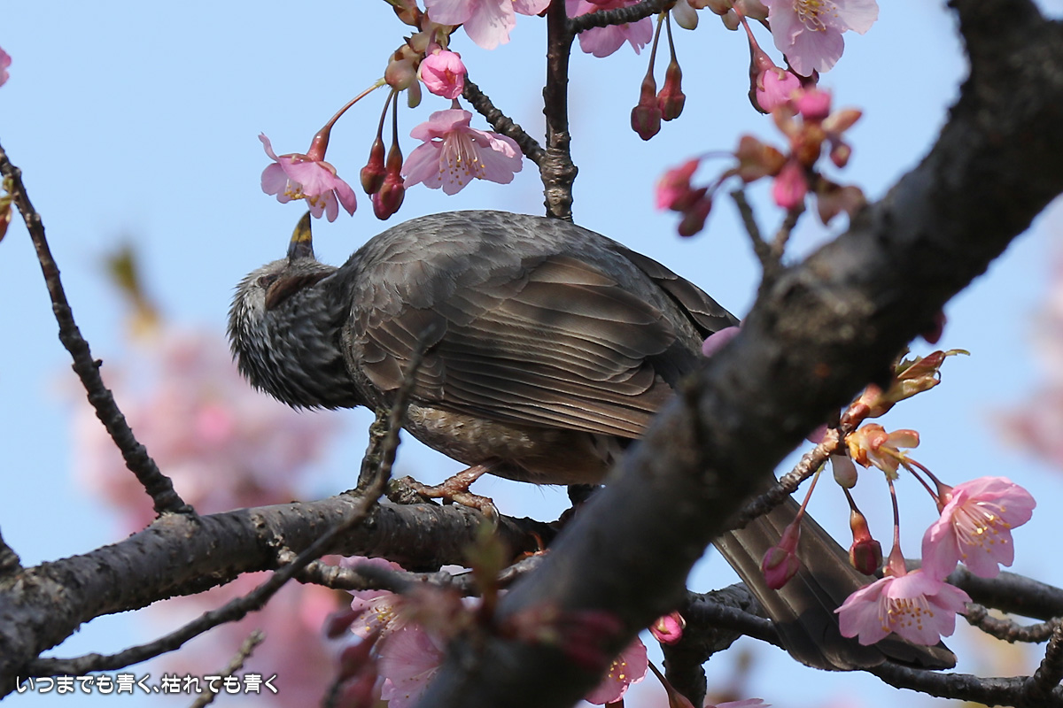 花がイマイチでしたので、目は野鳥に向いてしまいました。以前に来た時はメジロがいたのに、今回はヒヨドリばかりでした。ヒヨドリに追い払われたのでしょうか。そういえば、近くの平芝梅林公園でも今年はメジロを見かけませんでした。野鳥は、AFとはいえピントを正確に合わせるのは私にはまだ難しすぎますので、ピントが甘いものが多いですが、予想できない動きの瞬間を切り出すと言う作業はとても面白いものです。 河津桜の花の花粉が付いて黄色くなったくちばしが可愛いです。