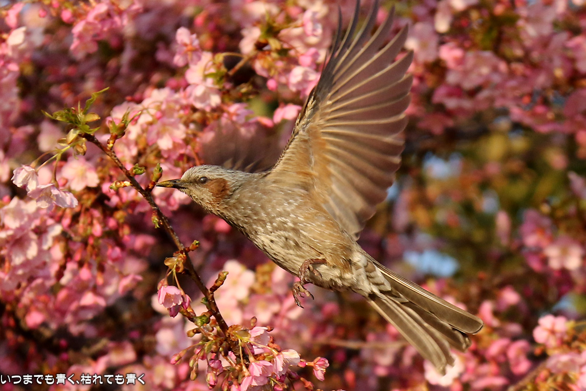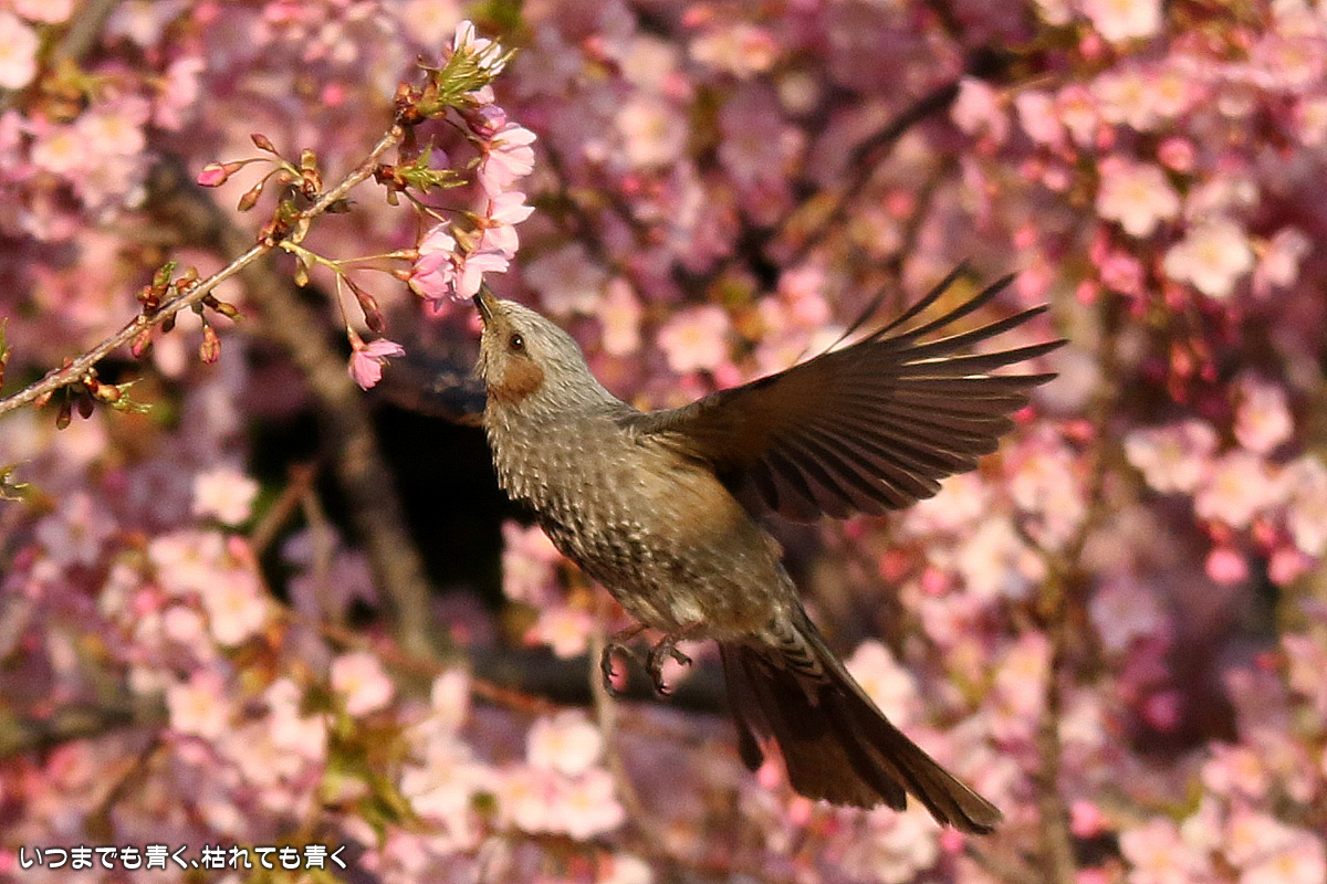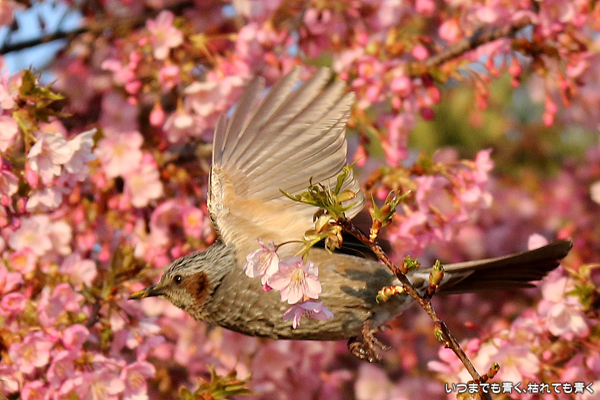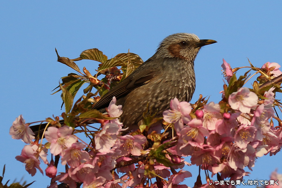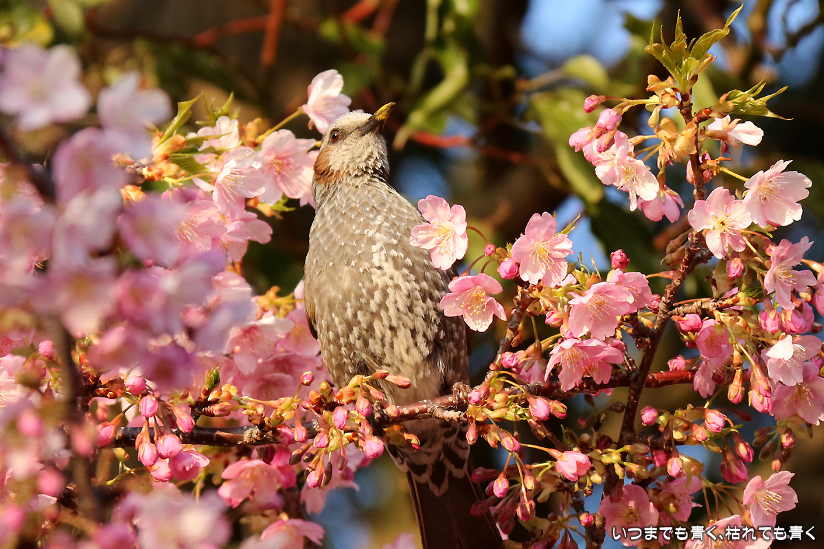 花がイマイチでしたので、目は野鳥に向いてしまいました。以前に来た時はメジロがいたのに、今回はヒヨドリばかりでした。ヒヨドリに追い払われたのでしょうか。そういえば、近くの平芝梅林公園でも今年はメジロを見かけませんでした。野鳥は、AFとはいえピントを正確に合わせるのは私にはまだ難しすぎますので、ピントが甘いものが多いですが、予想できない動きの瞬間を切り出すと言う作業はとても面白いものです。 河津桜の花の花粉が付いて黄色くなったくちばしが可愛いです。