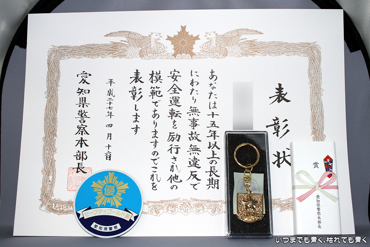 もう少し表彰状も記念品も重みが感じられるものや仕上がりだと思っていましたが、完全に定型的で形式的なものでした。まぁ、ひとりひとり表彰文を変えていたり質の良い記念品を渡していたら、手間や費用ばかりかかって仕方がないので、こんなものなのかも知れません。ただ、29年もの無事故無違反を「15年以上」とひとくくりではなくて、25年以上とかもう少し価値を高めてくれればよかったのにとは思いました。表彰の種類の関係上仕方がないことですけどね。