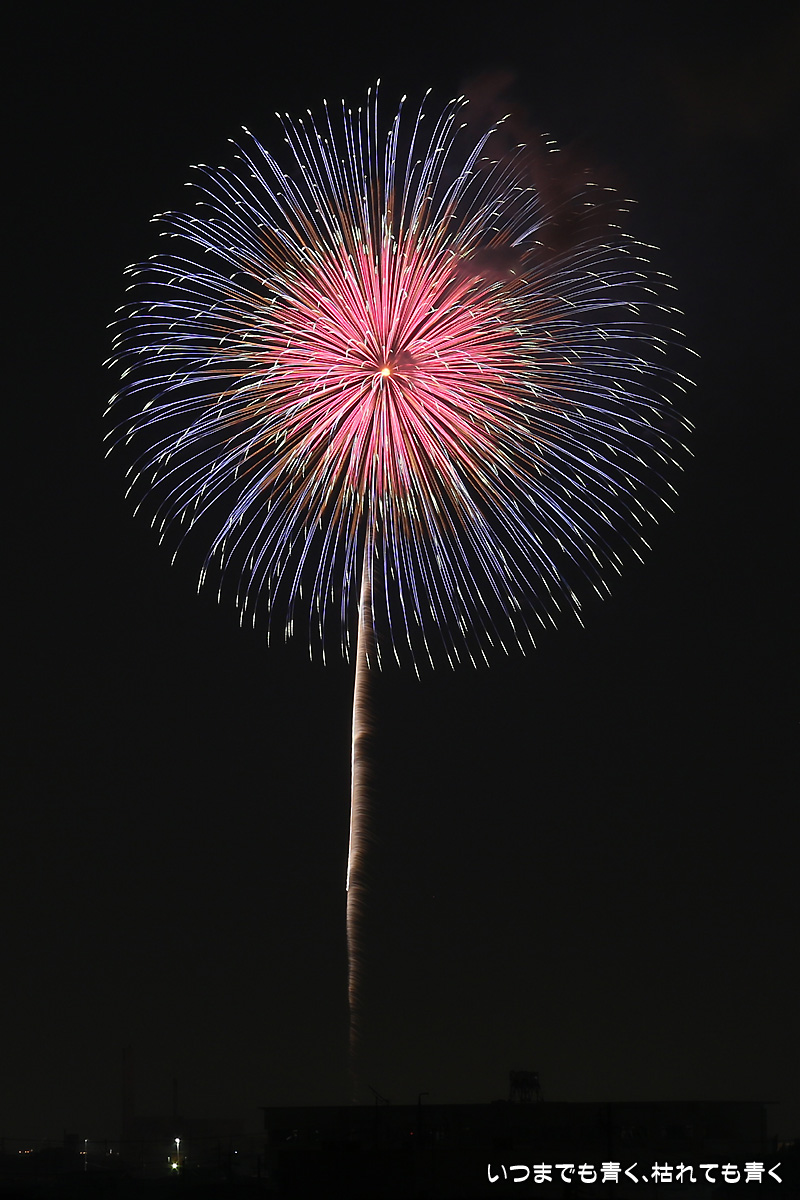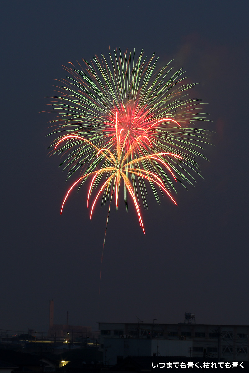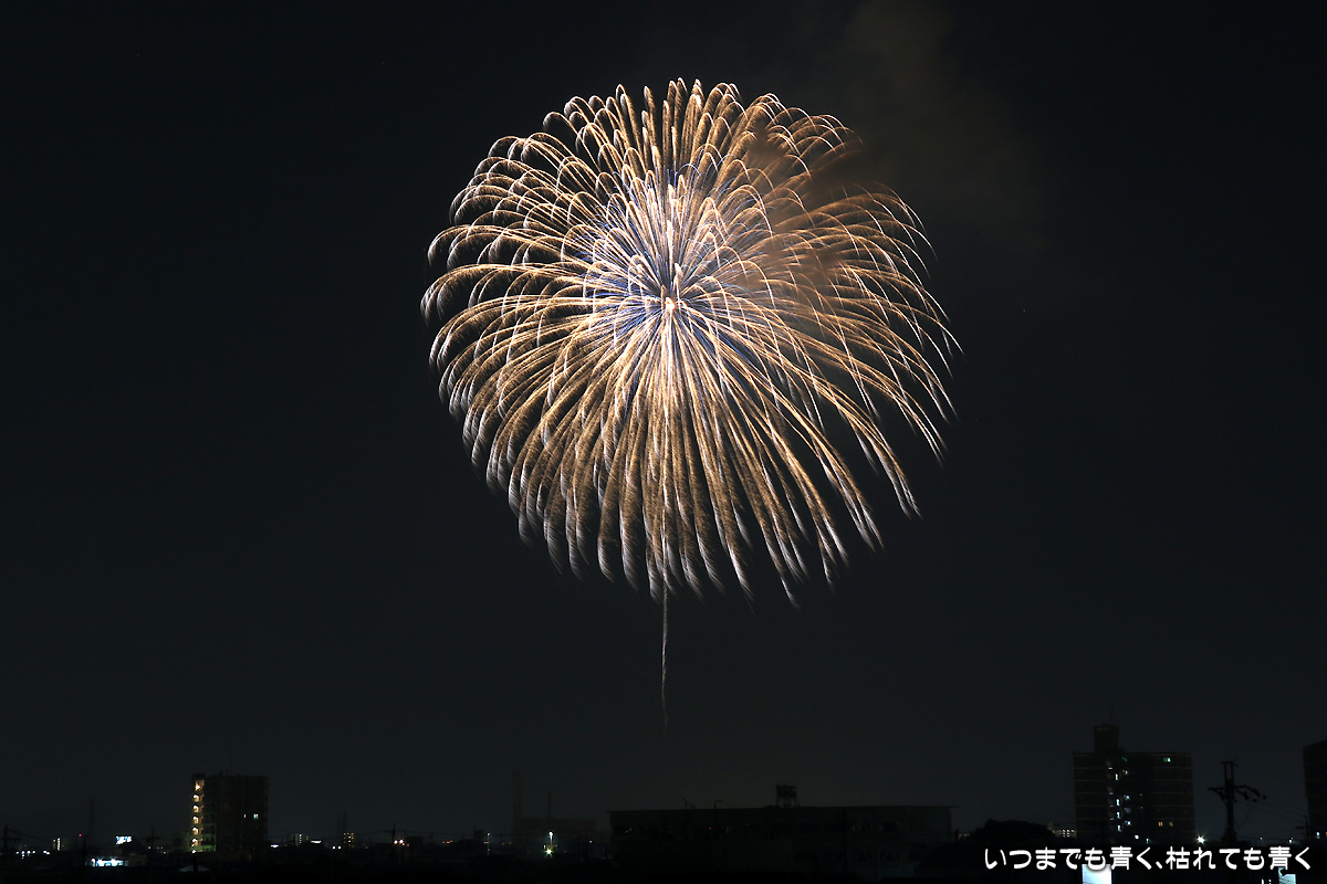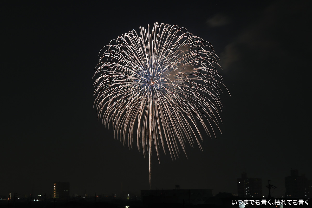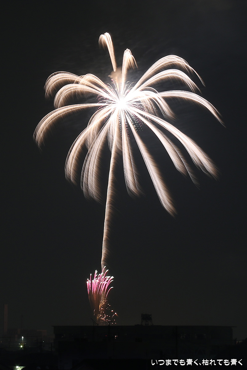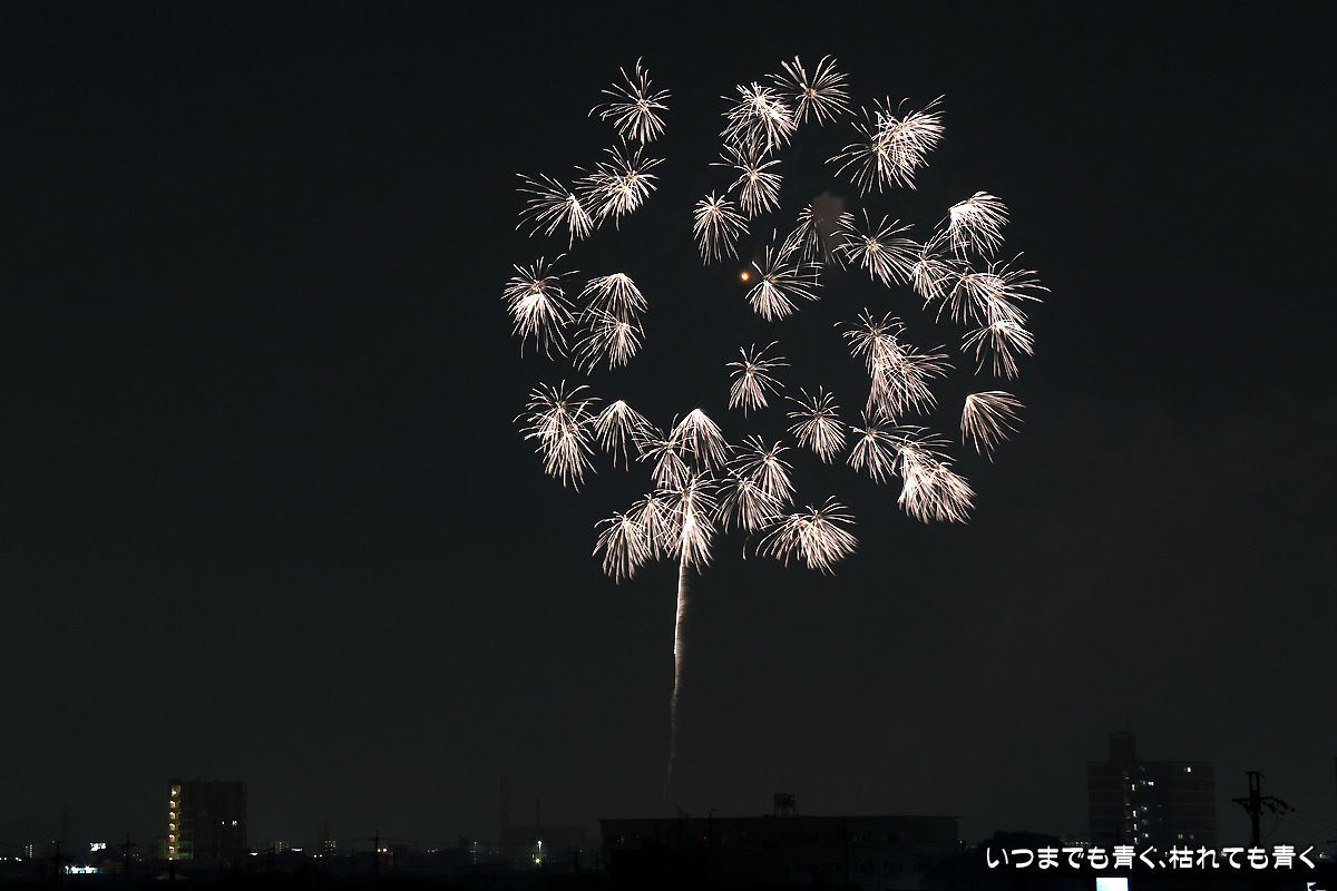 矢作川の打ち上げ場所と乙川の打ち上げ場所と撮影地点が正三角形に近い関係になっていて、両方の花火を一緒に入れての撮影がまったく絵になりませんでした。それぞれの花火は単調なので、競演させないと迫力がでません。そして堤防は人があふれ片側の撮影はどうしても人が入ってしまいます。満月に近い夜も空が明るくてダメですね。来年は両方が並んで見える地点(西側か東側?)を探したいと思います。