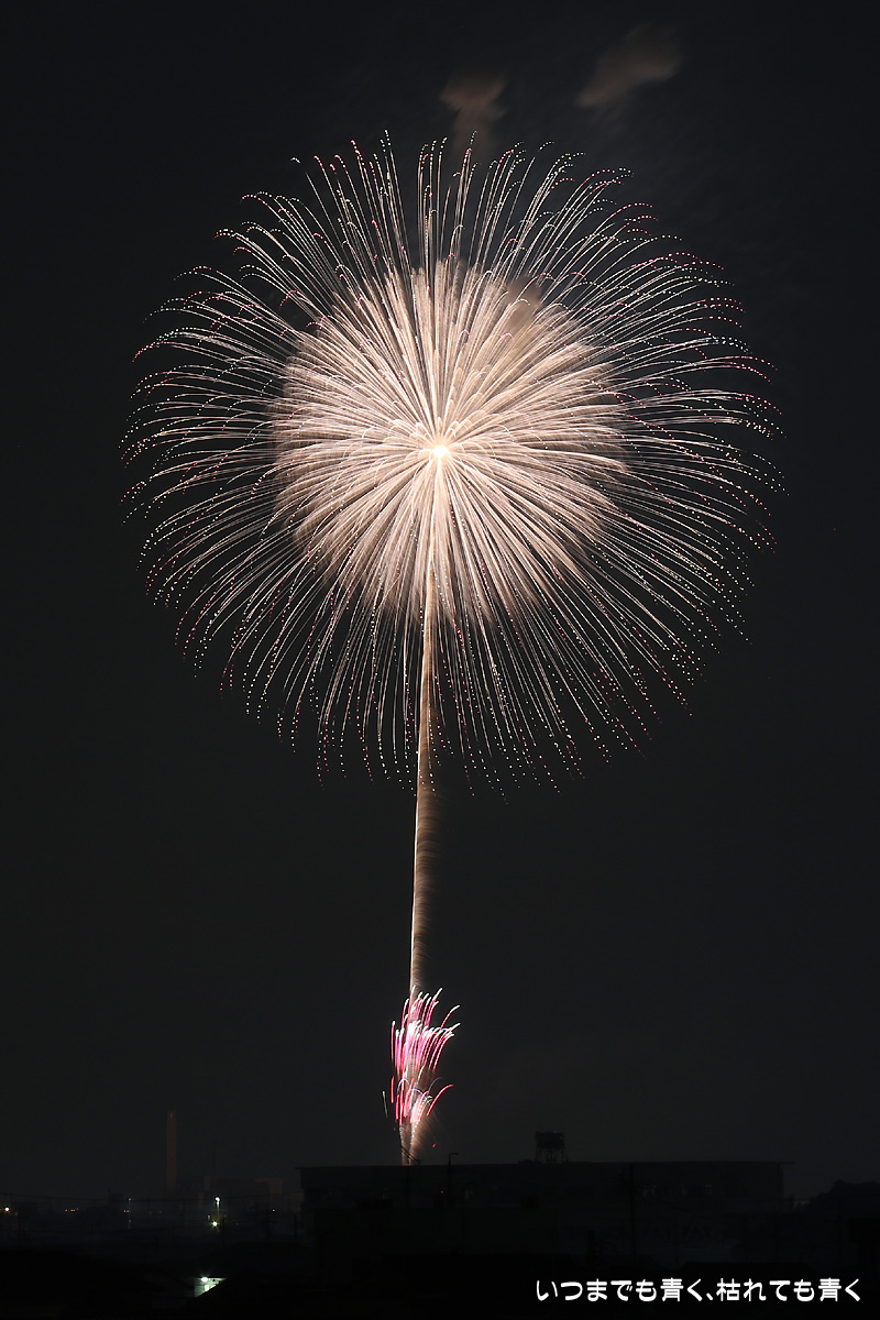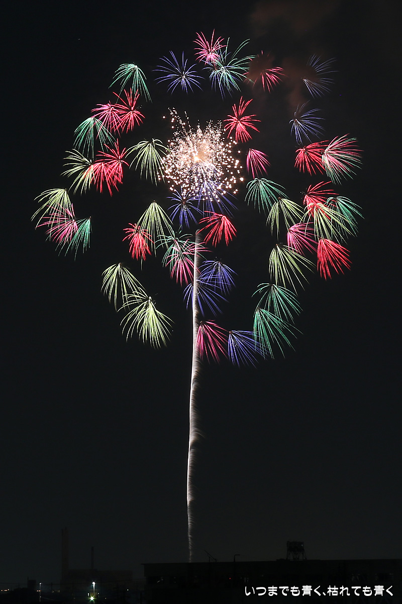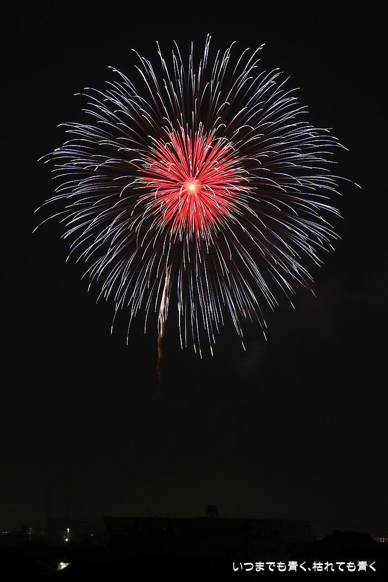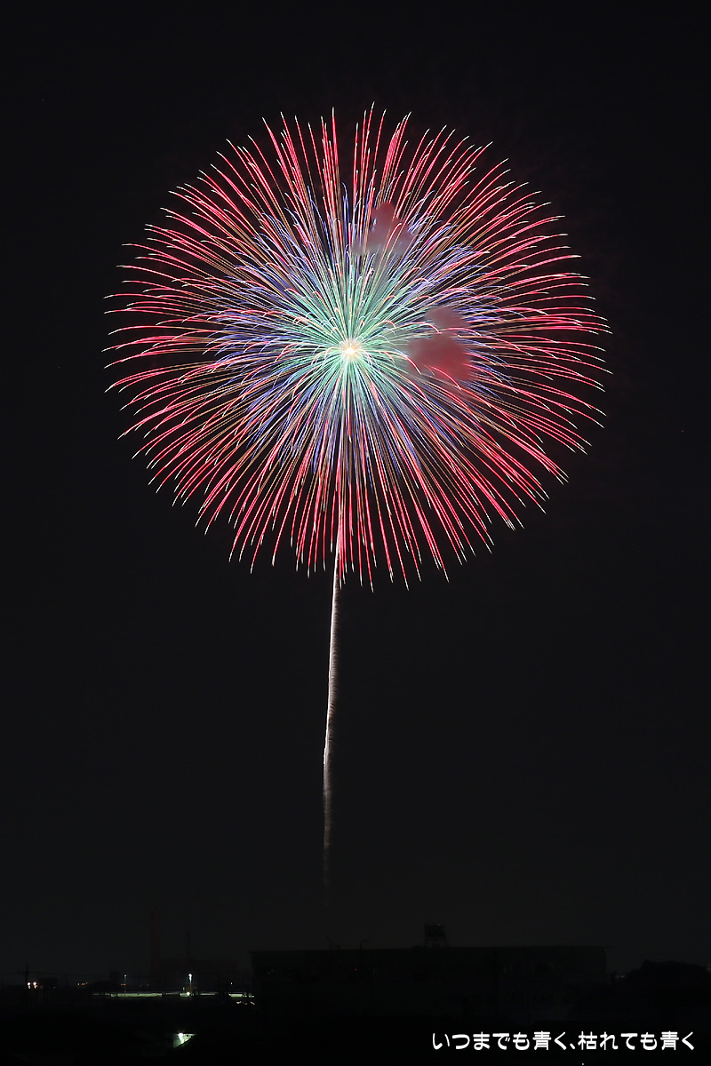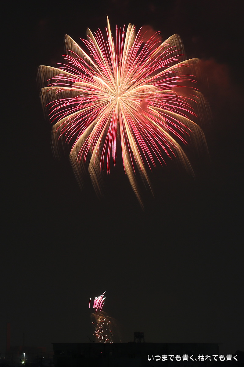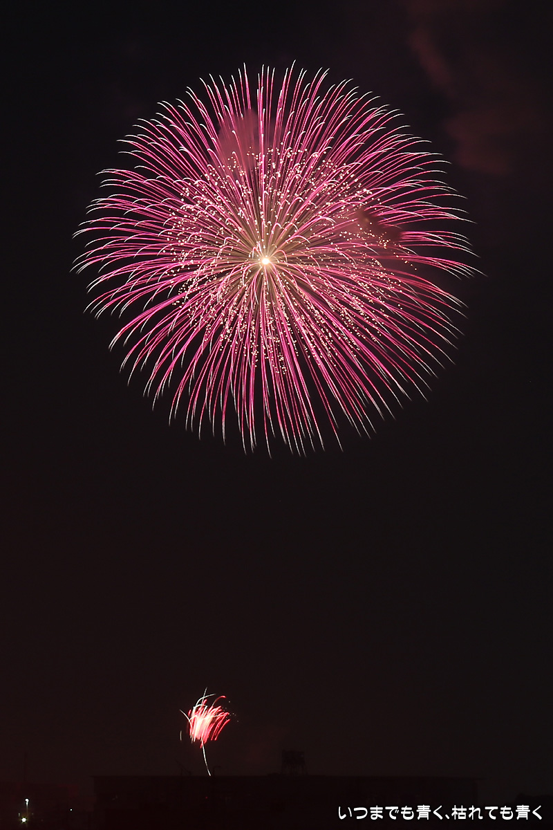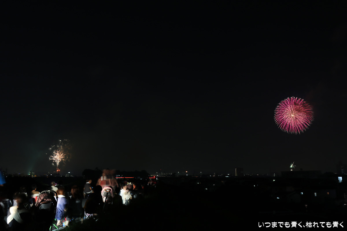 矢作川の打ち上げ場所と乙川の打ち上げ場所と撮影地点が正三角形に近い関係になっていて、両方の花火を一緒に入れての撮影がまったく絵になりませんでした。それぞれの花火は単調なので、競演させないと迫力がでません。そして堤防は人があふれ片側の撮影はどうしても人が入ってしまいます。満月に近い夜も空が明るくてダメですね。来年は両方が並んで見える地点(西側か東側?)を探したいと思います。