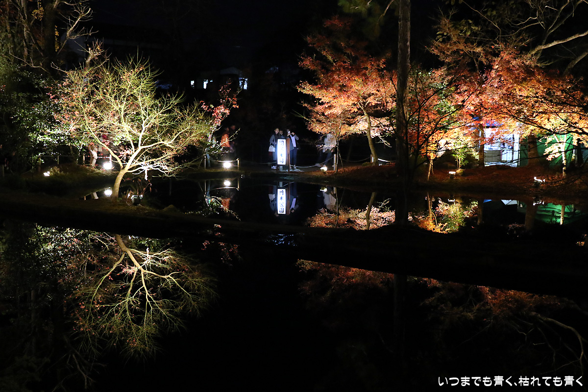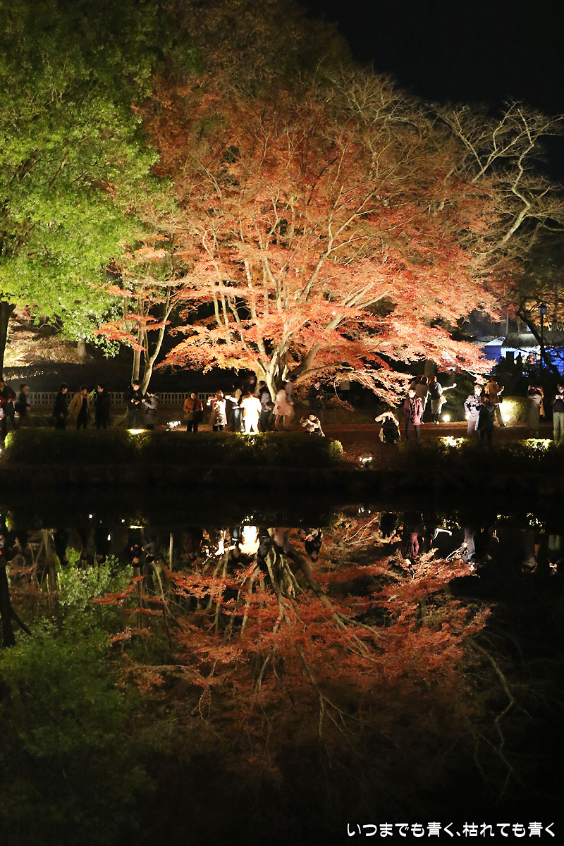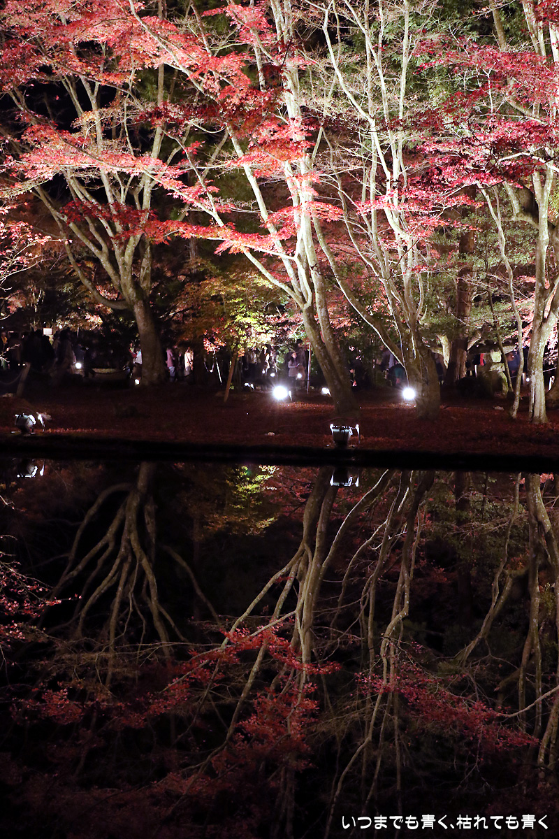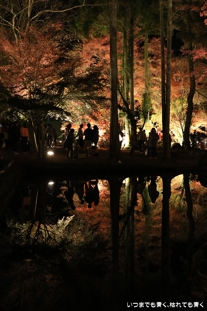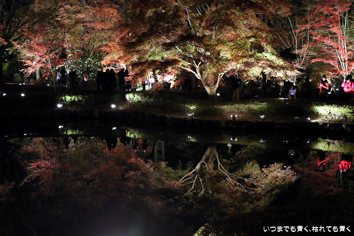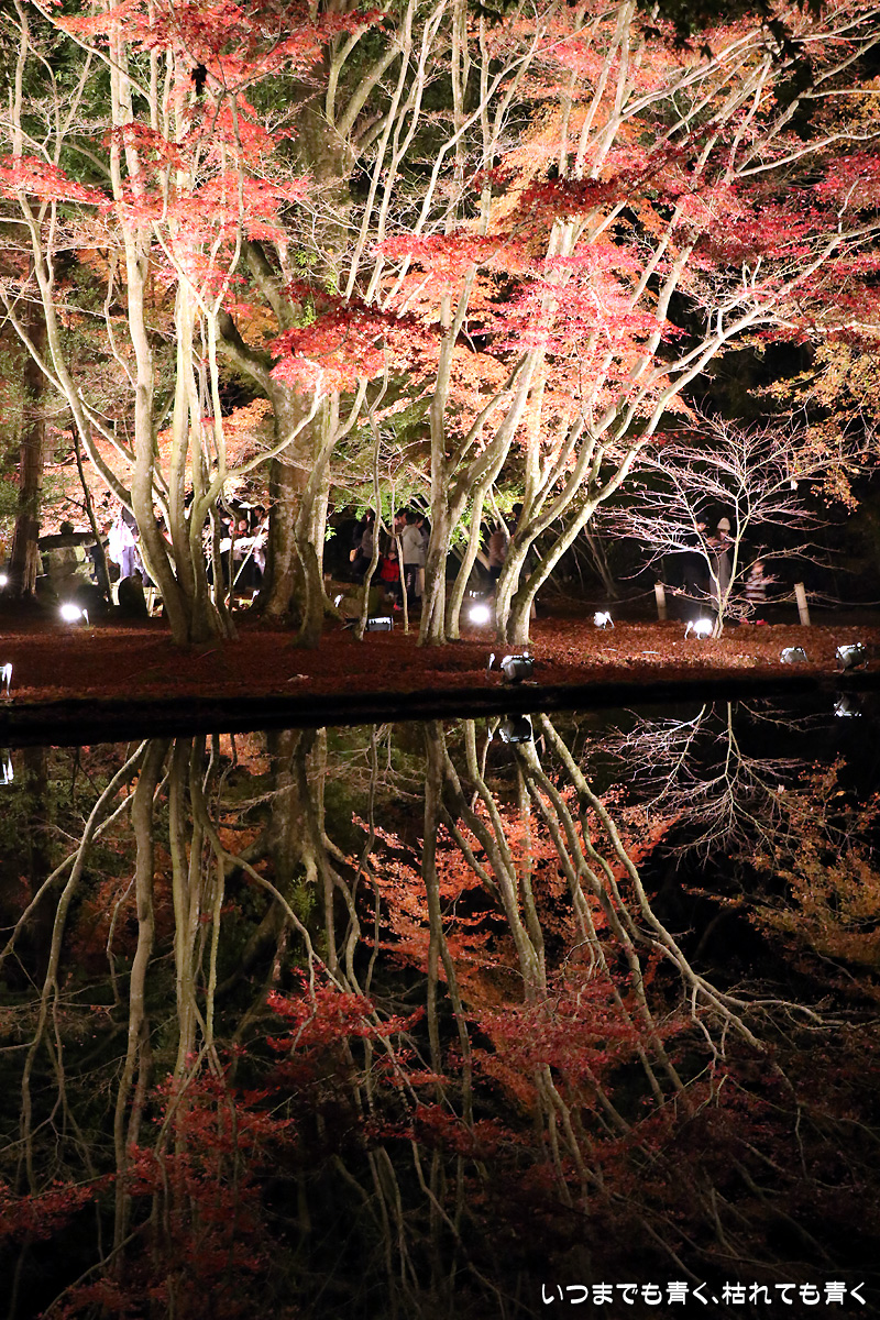今日は今年のライトアップ最終日。雨が心配されましたが、なんとか持ちこたえてくれて風もなく穏やかな池の水面。そこに映し出された紅葉は素晴らしいものでした。どこからが現実でどこからが映し出された世界かわからなくなります。まさに吸い込まれる感覚というのを体感できます。いくつかの池でいろんな角度から、いろんな幻想的な光景を楽しめました。