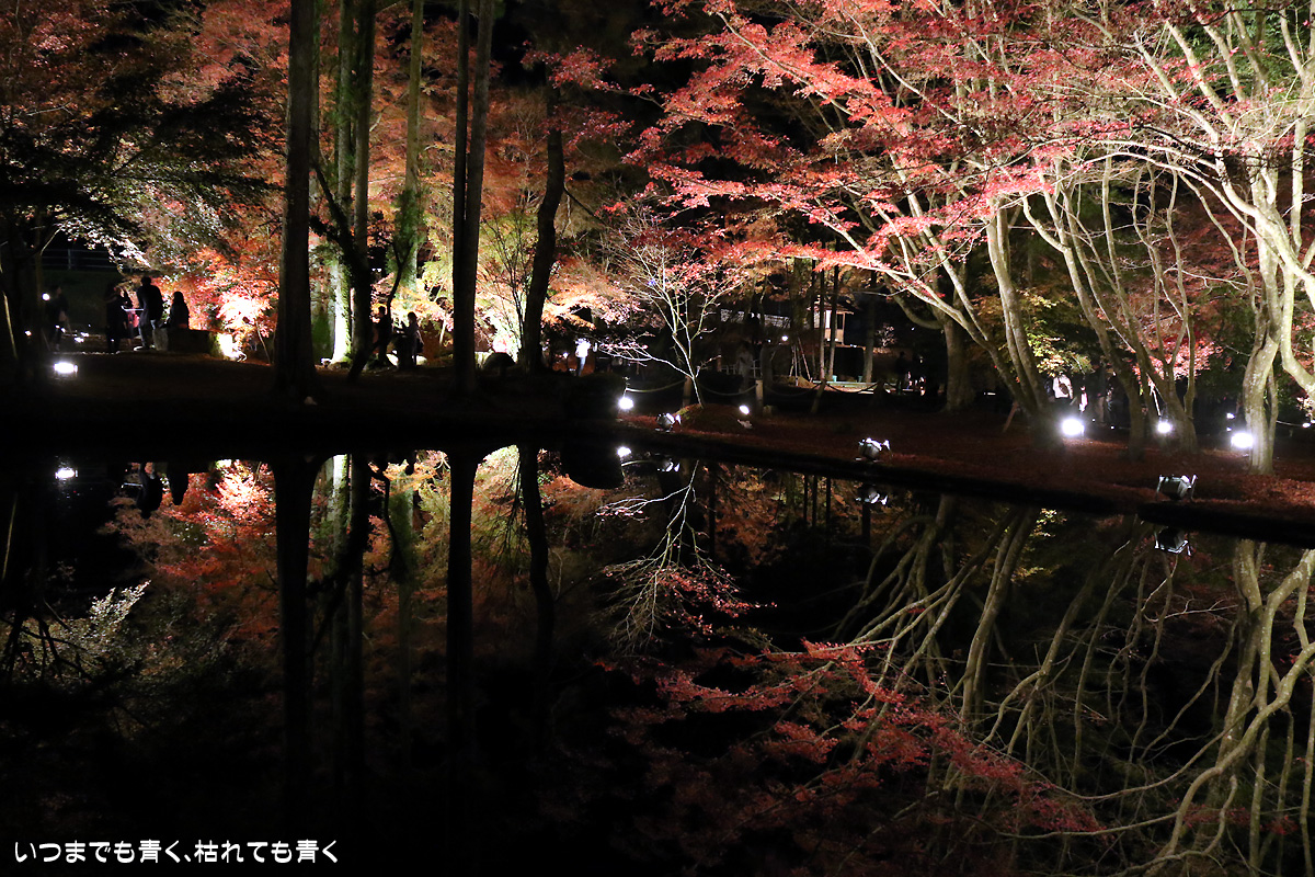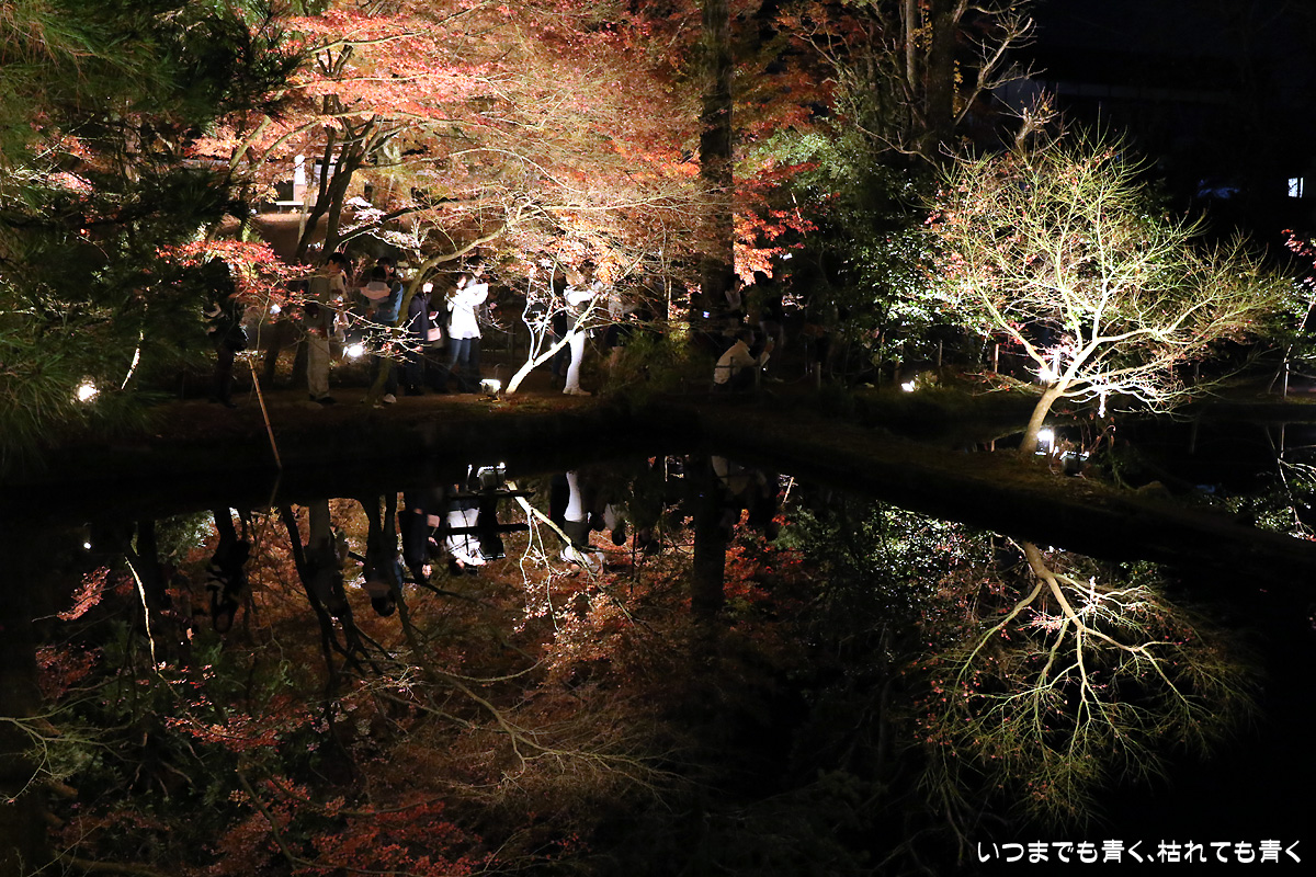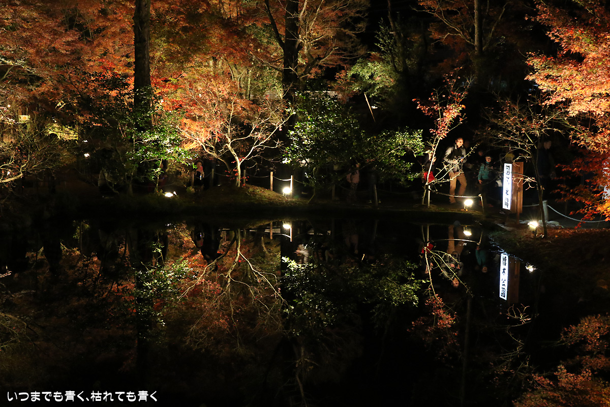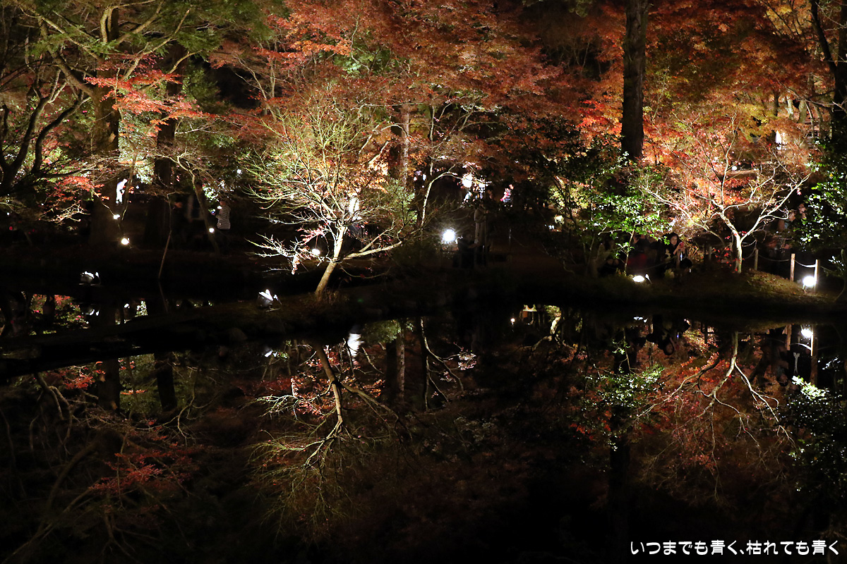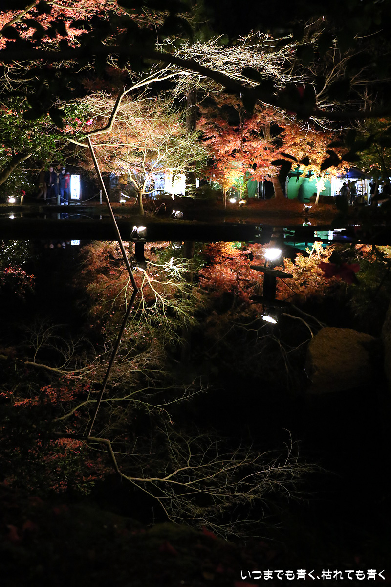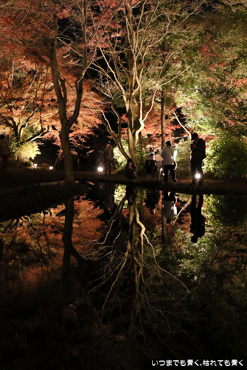 今日は今年のライトアップ最終日。雨が心配されましたが、なんとか持ちこたえてくれて風もなく穏やかな池の水面。そこに映し出された紅葉は素晴らしいものでした。どこからが現実でどこからが映し出された世界かわからなくなります。まさに吸い込まれる感覚というのを体感できます。いくつかの池でいろんな角度から、いろんな幻想的な光景を楽しめました。
